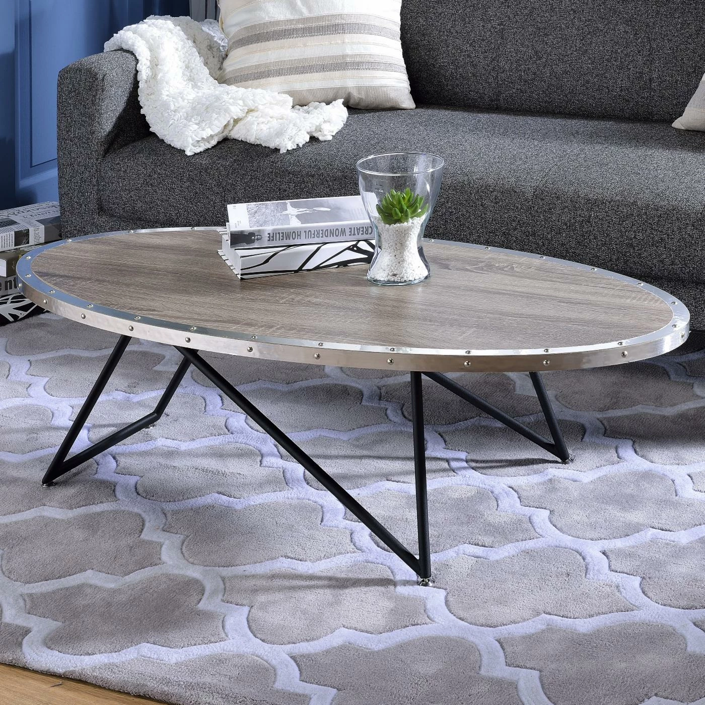 Sleek, simple lines give the ACME Allis Wooden Coffee Table a versatile silhouette that blends easily with many dΓ©cor styles. Offered in your choice of available finish, this oval-shaped coffee table features a wooden top and a metal frame studded with nail heads. Slender V-shaped legs lend a modern look to this accent piece that’s infused with industrial style.