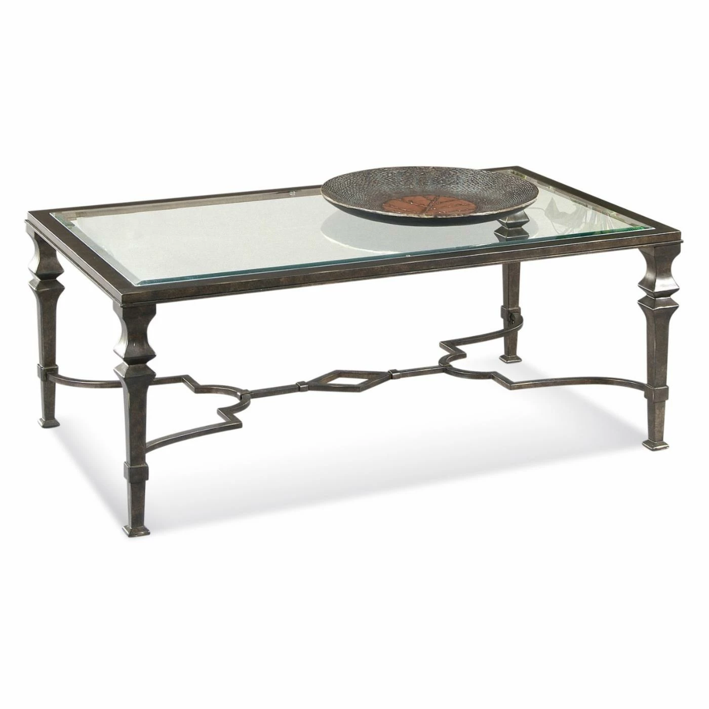 Crafted from elegant wrought iron finished with an antiqued burnished bronze, the Bassett Mirror Lido Rectangular Cocktail Table offers sophisticated style that coordinates with any design aesthetic and materials. The beveled glass top catches the light to showcase coffee table books or other decorative items and the ornate stretcher adds a striking detail.
