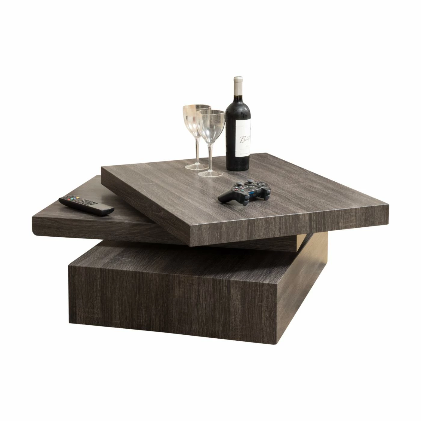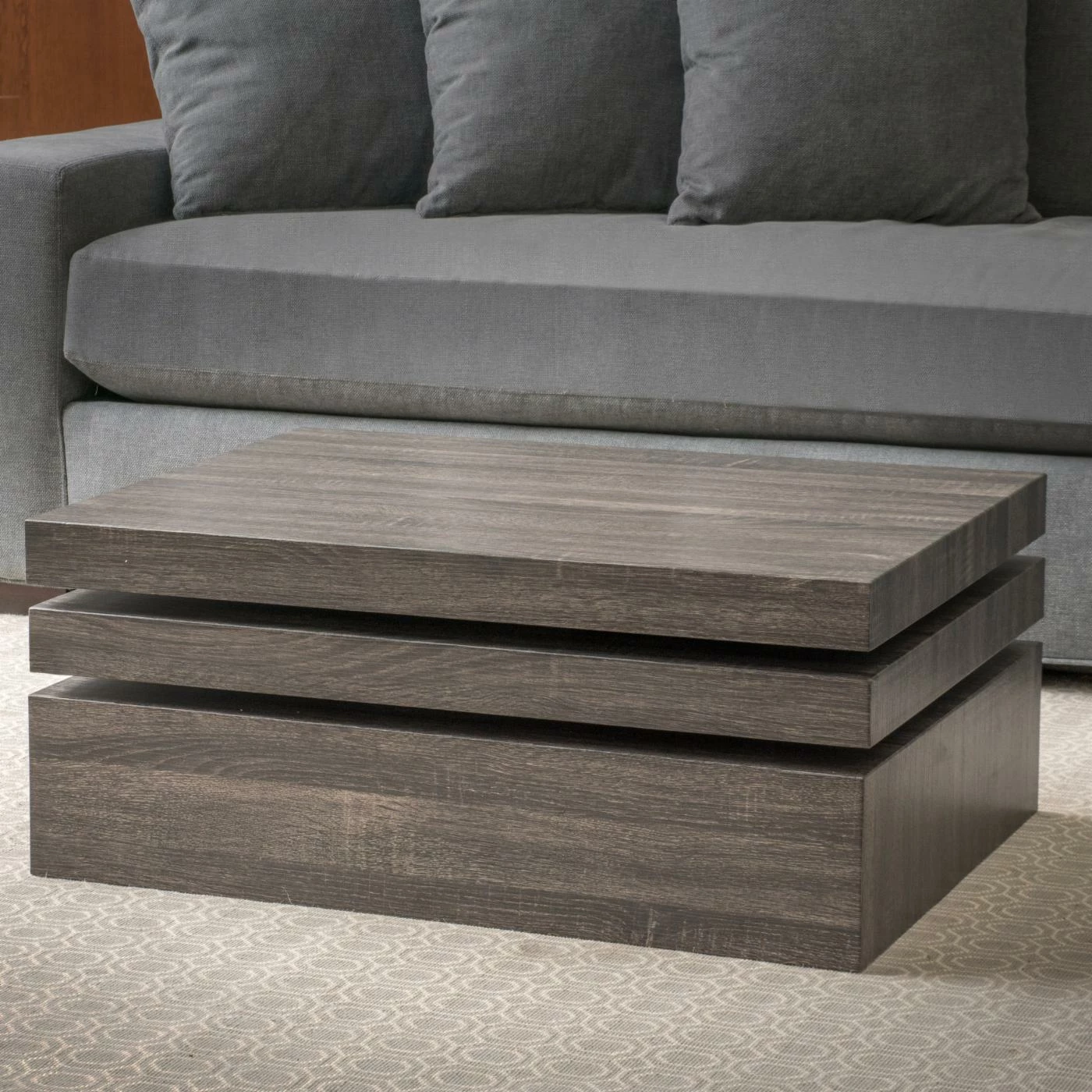 Equipped with a swiveling tabletop, the Modernesque Rectangular Rotating Coffee Table instantly provides more storage space for drinks, remote controls, and other items when you need it. The table is built to last out of engineered wood. Every inch bears a black finish with a rustic wood grain effect.