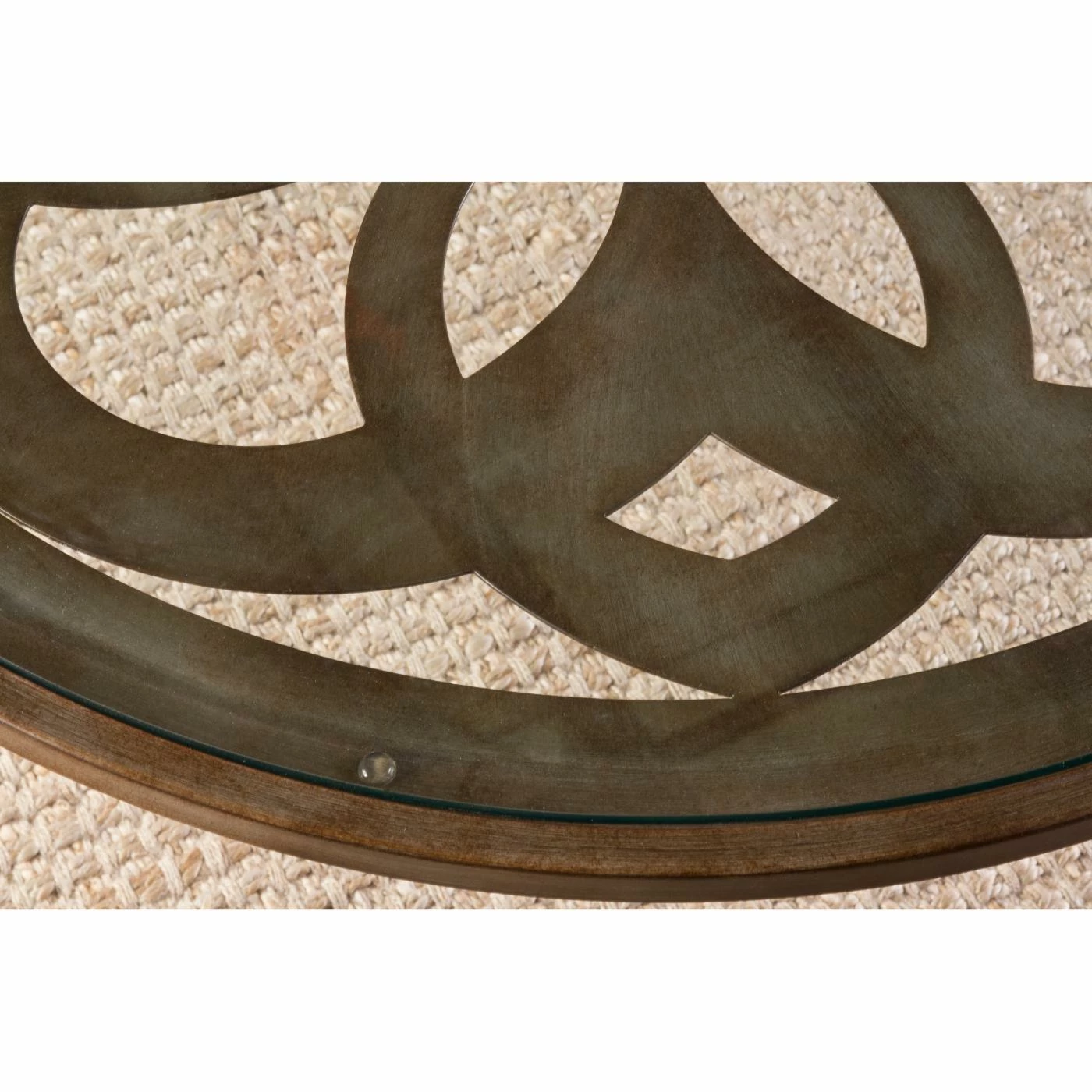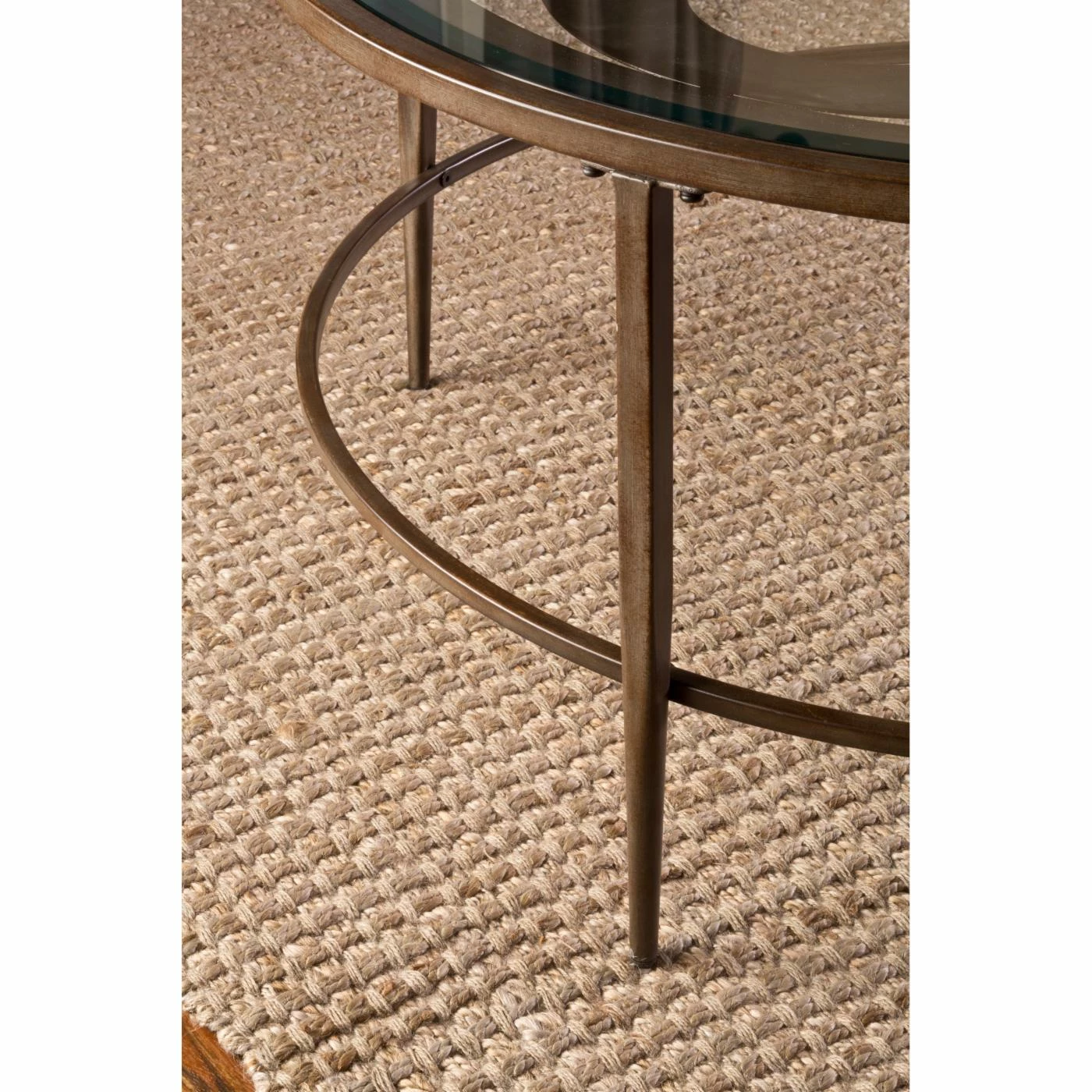 Delightfully tapered legs and a bold floral design make this Hillsdale Marsala Round Coffee Table a distinctive choice for your living room. The beveled-glass top shows off the flower pattern nicely and gives this coffee table its practicality. Assembly required.