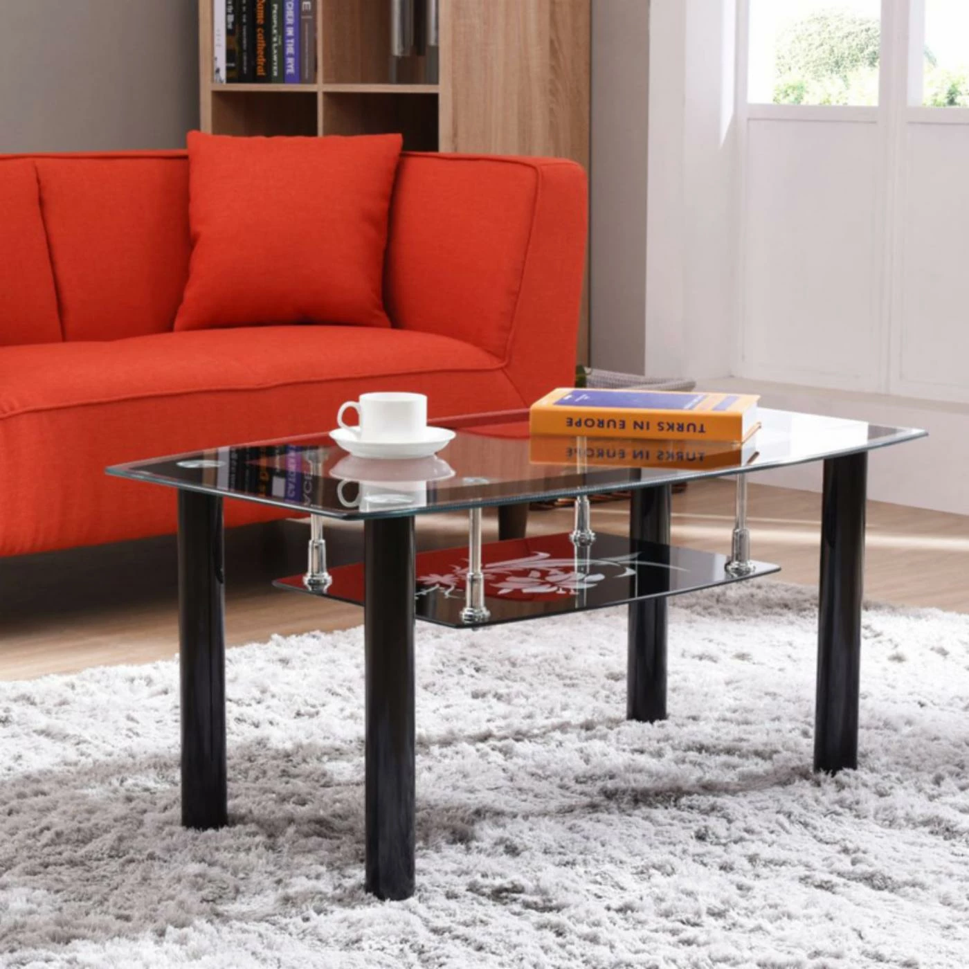 The Hodedah HICT26 Coffee Table will add striking style to your living room. The clear glass top on this coffee table has a black border. The lower shelf features a delicate floral design, and is suspended from the table top with chrome-colored metal posts. Beveled safety glass and gentle curves soften the edges of this table.