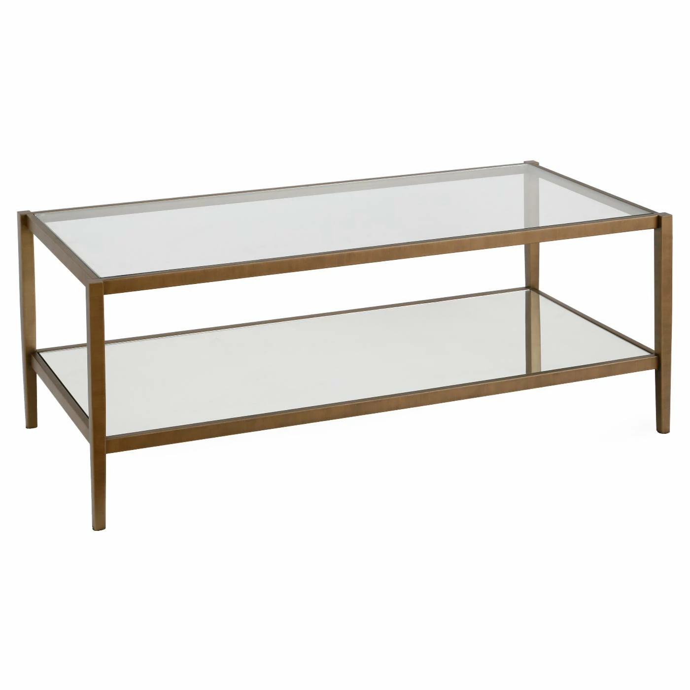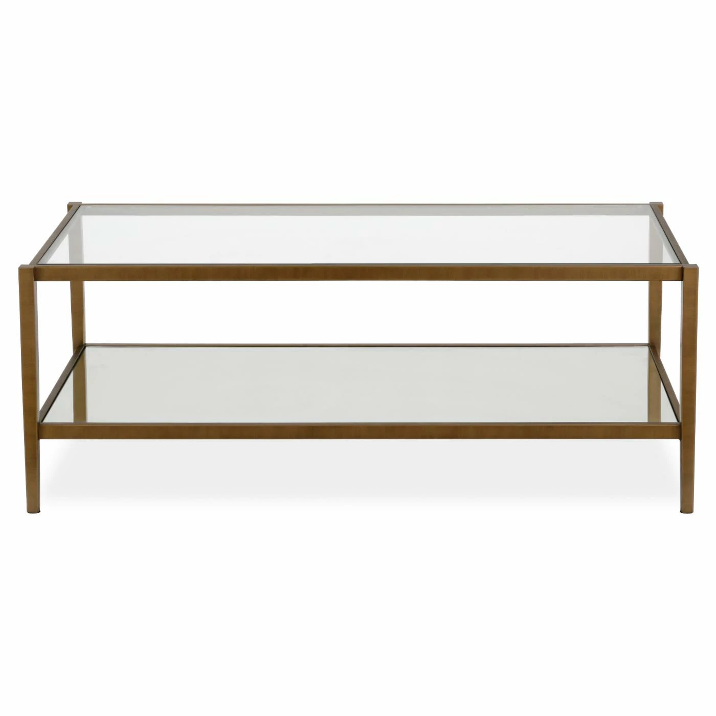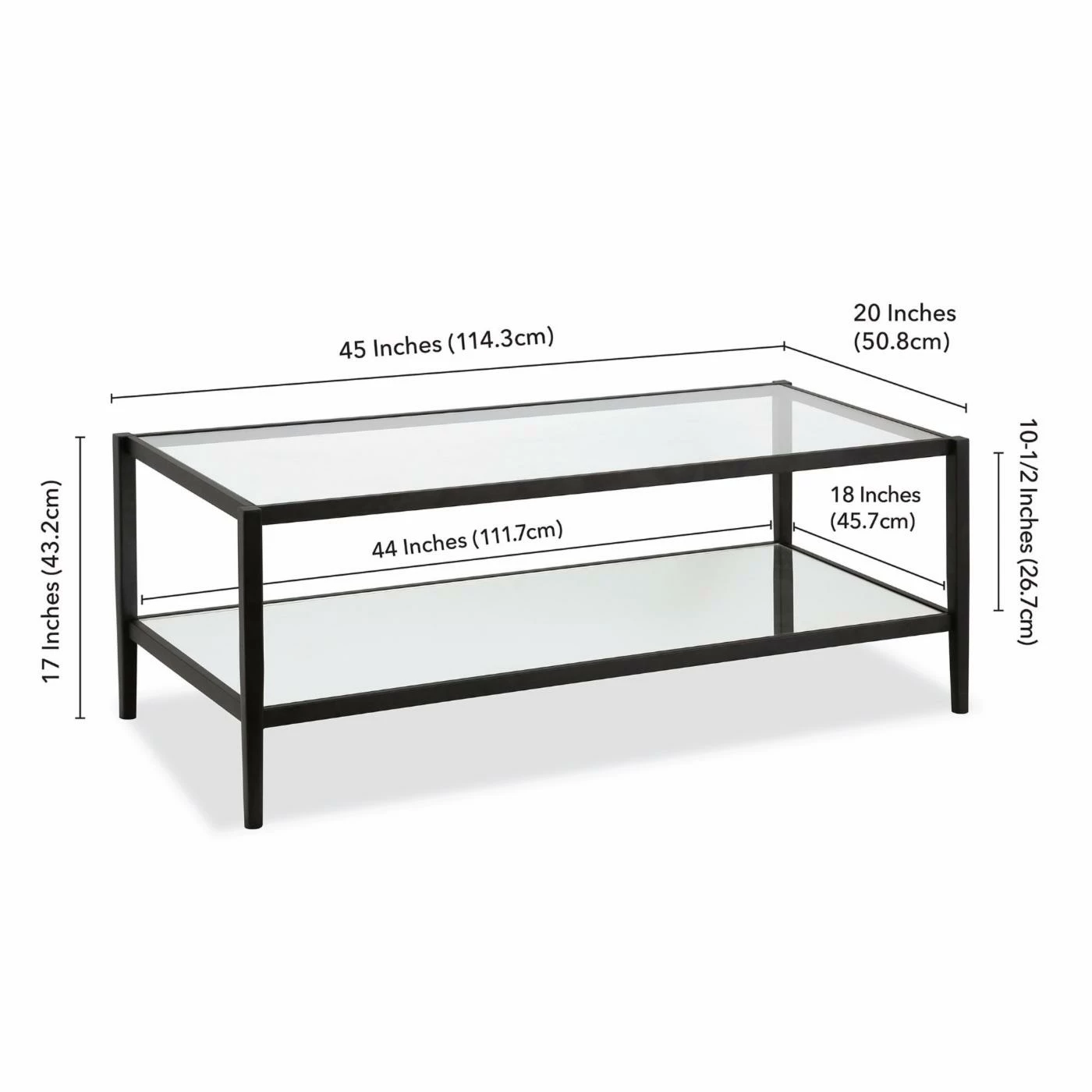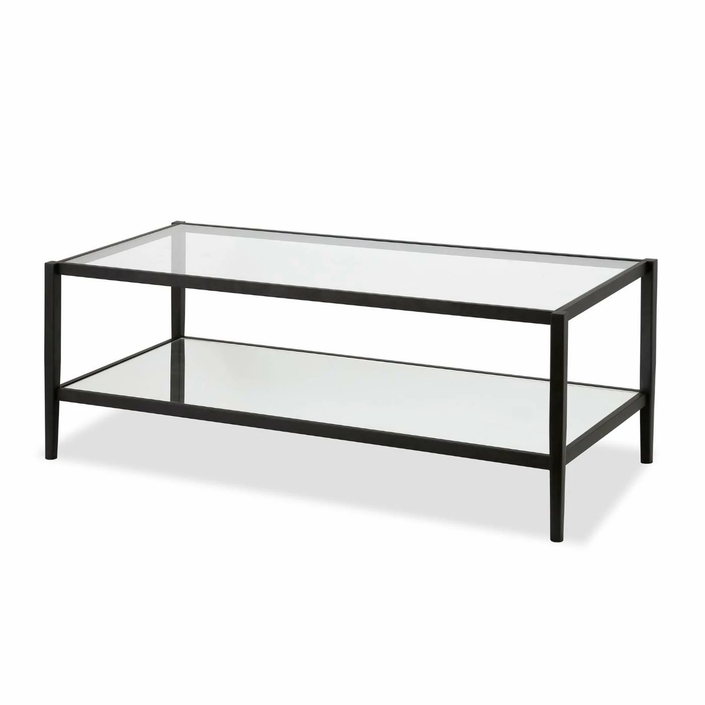 You’ve replaced grandma’s old sofa with a sharp modern sectional. Now make sure the rest of your living room matches with the Hudson & Canal Wilda Coffee Table. This coffee table offers a streamlined modern look that’s supported by a tubed steel frame. Tapered block legs ensure a stable base. The rectangular top is augmented by a roomy, open-sided lower shelf. Both the shelf and top are built from clear tempered glass. Whether you need a place to set remotes or snacks, storage baskets, or a smart decorative creation, this table is an excellent complement to any contemporary setting. Choose among the available finish options.