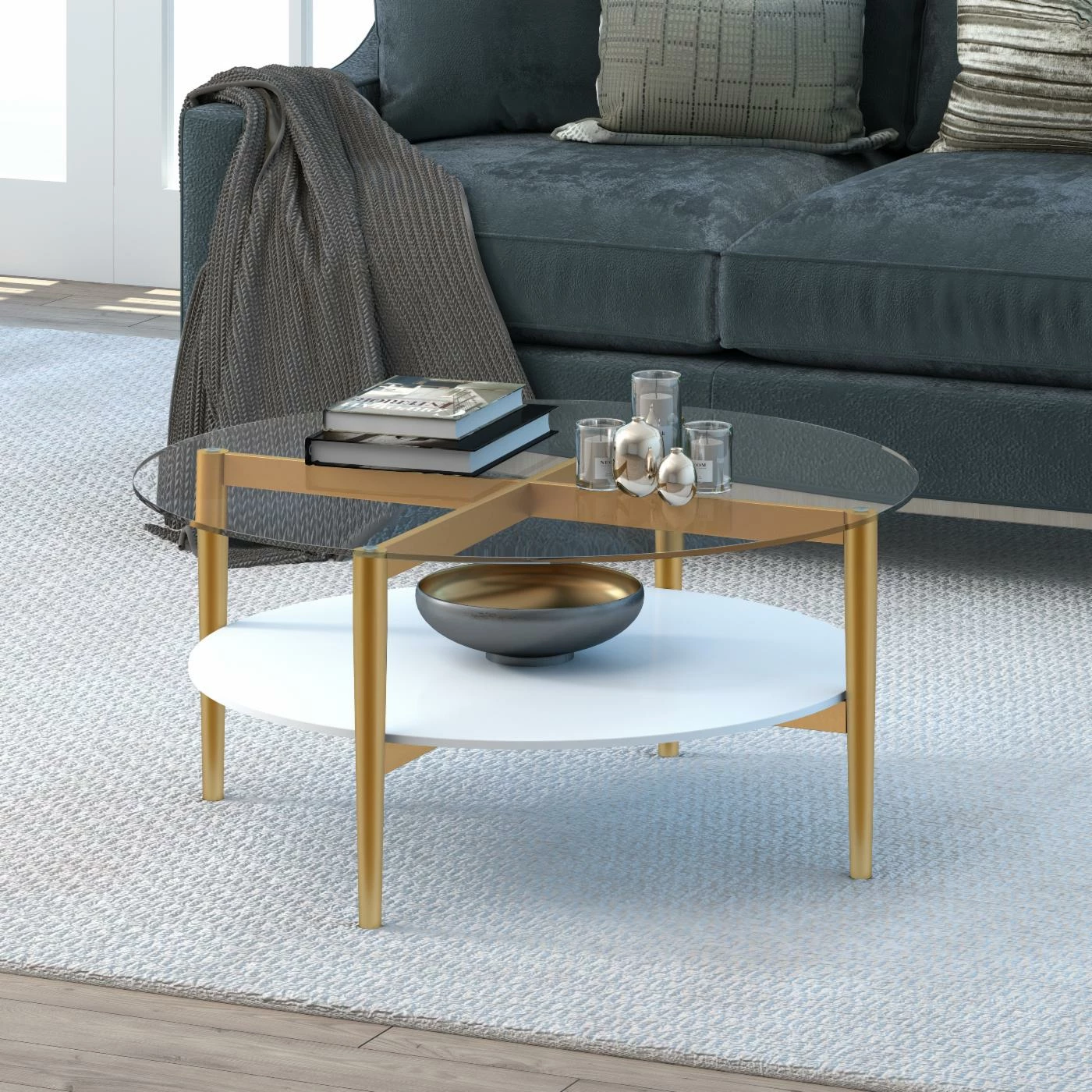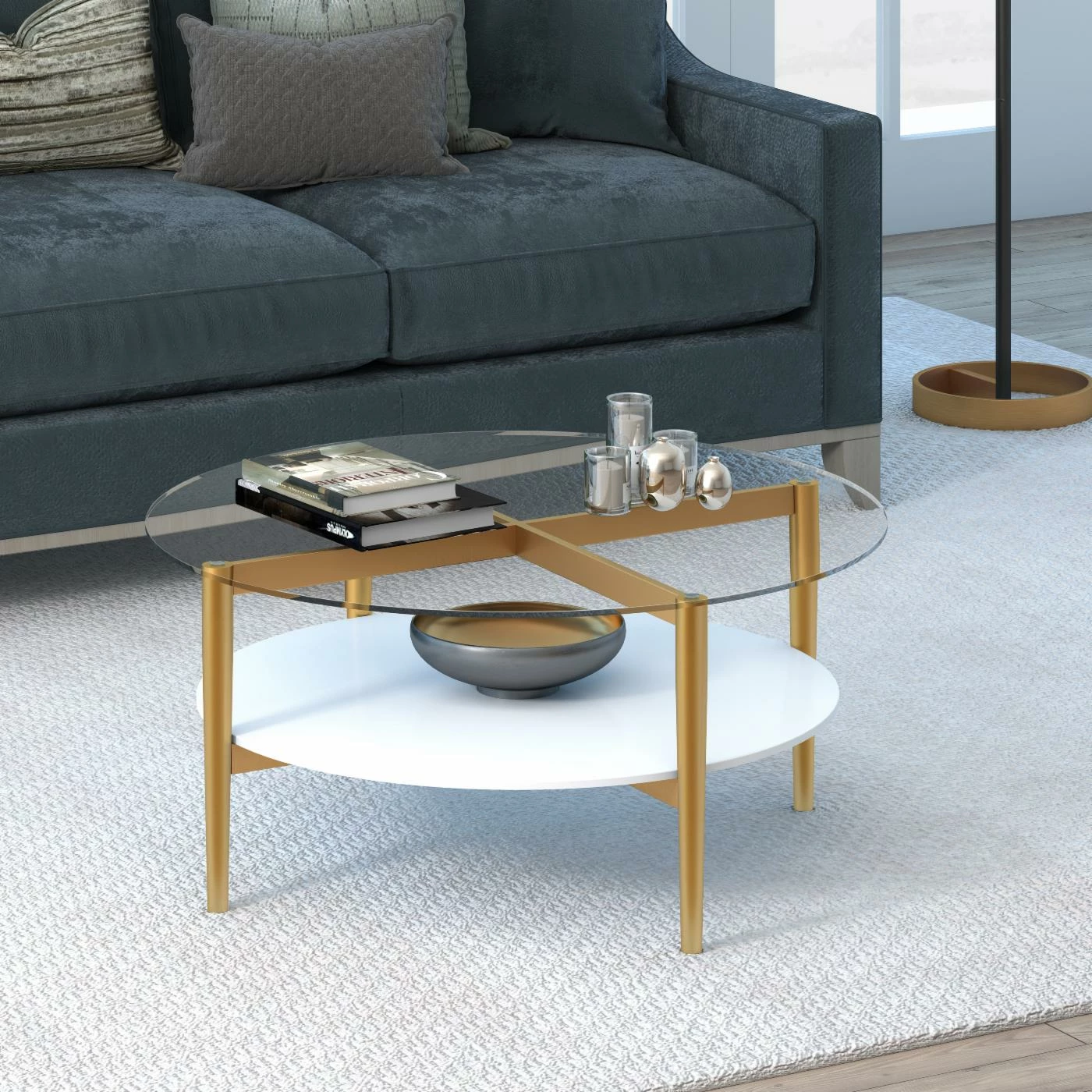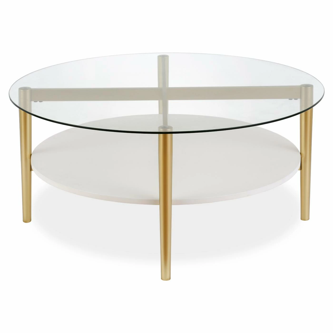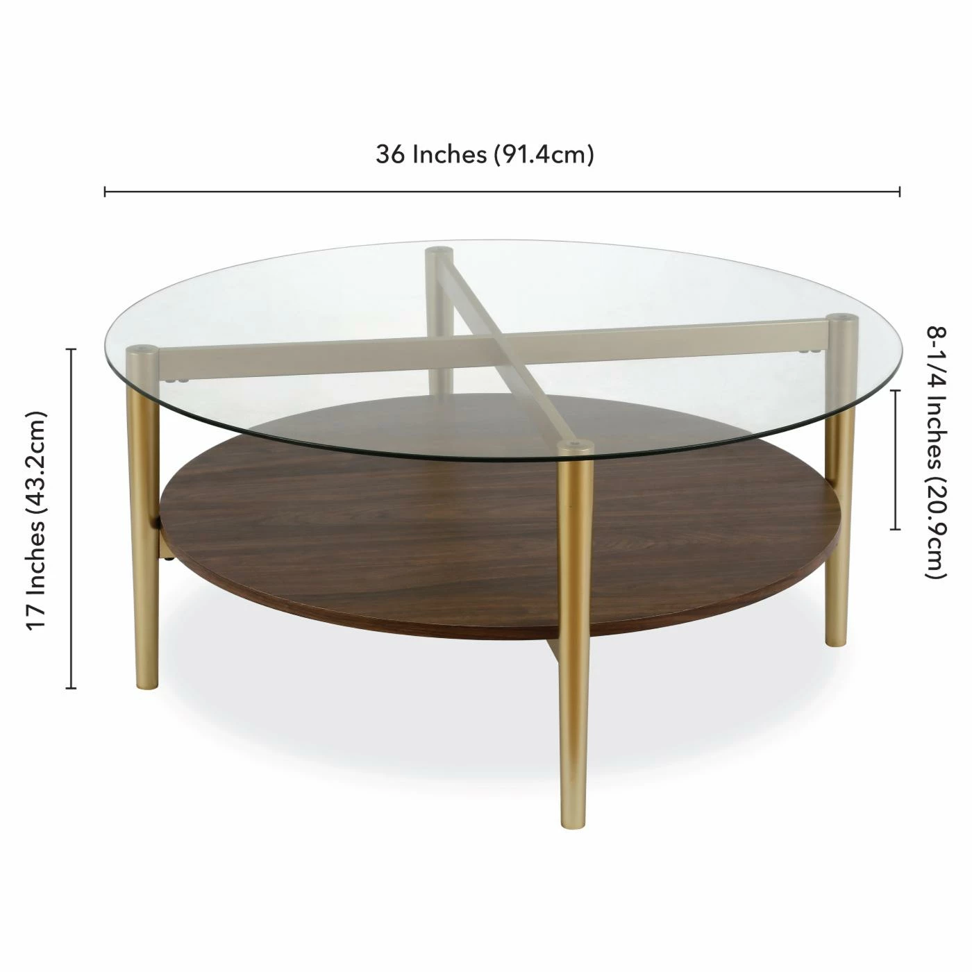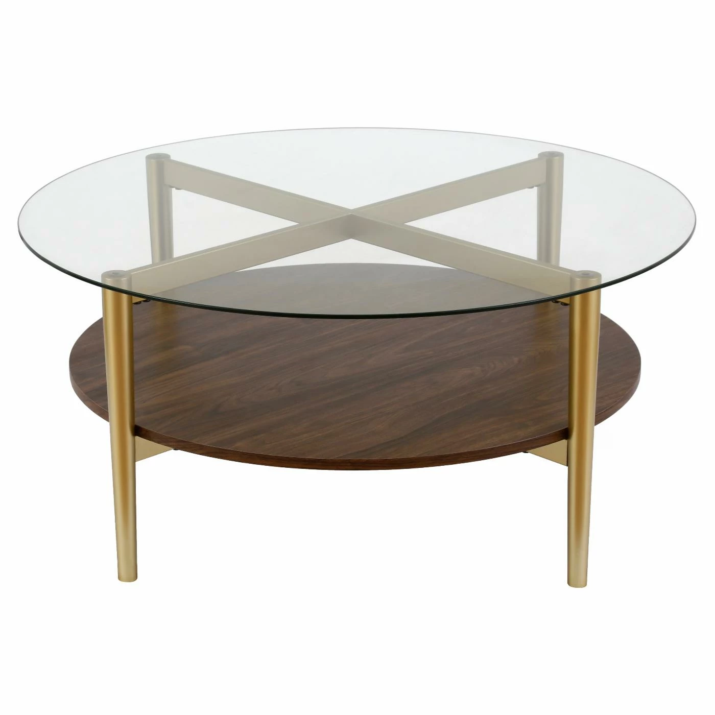 Dazzle your guests with a brand new living room centerpiece with the Hudson & Canal Ludo Coffee Table. This round coffee table sports a two tone design and mixes materials for an intriguing mid-century appeal. The frame is built from steel with round tapered legs and is finished in a polished gold. The table surface is crafted from clear tempered glass with a matching wood shelf beneath, allowing you to craft a space for storage and display. Choose your ideal wood finish from the available options.
