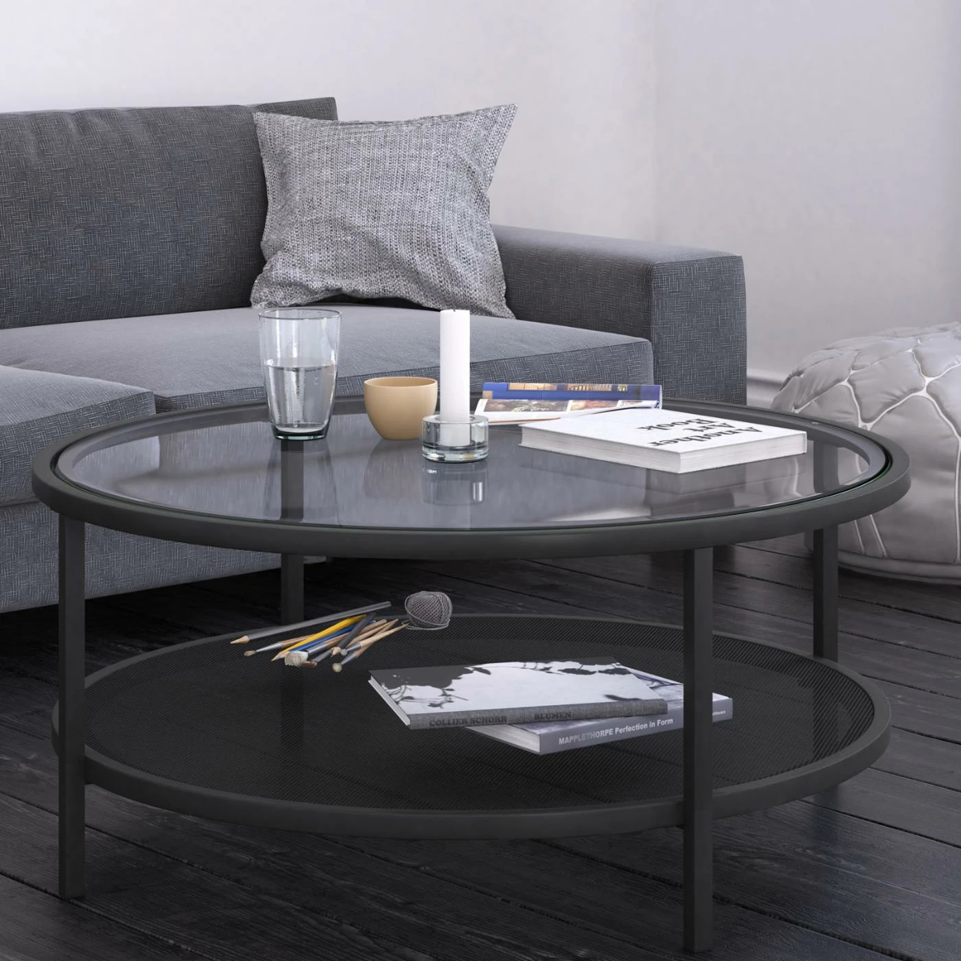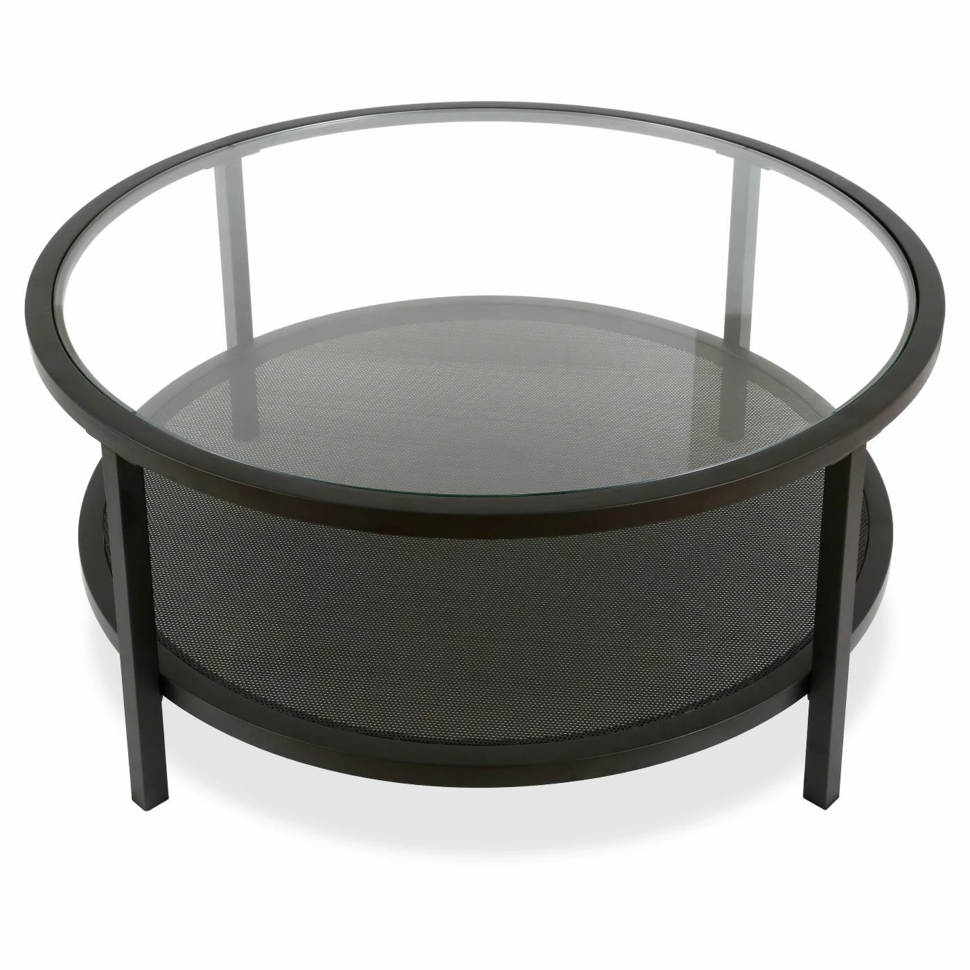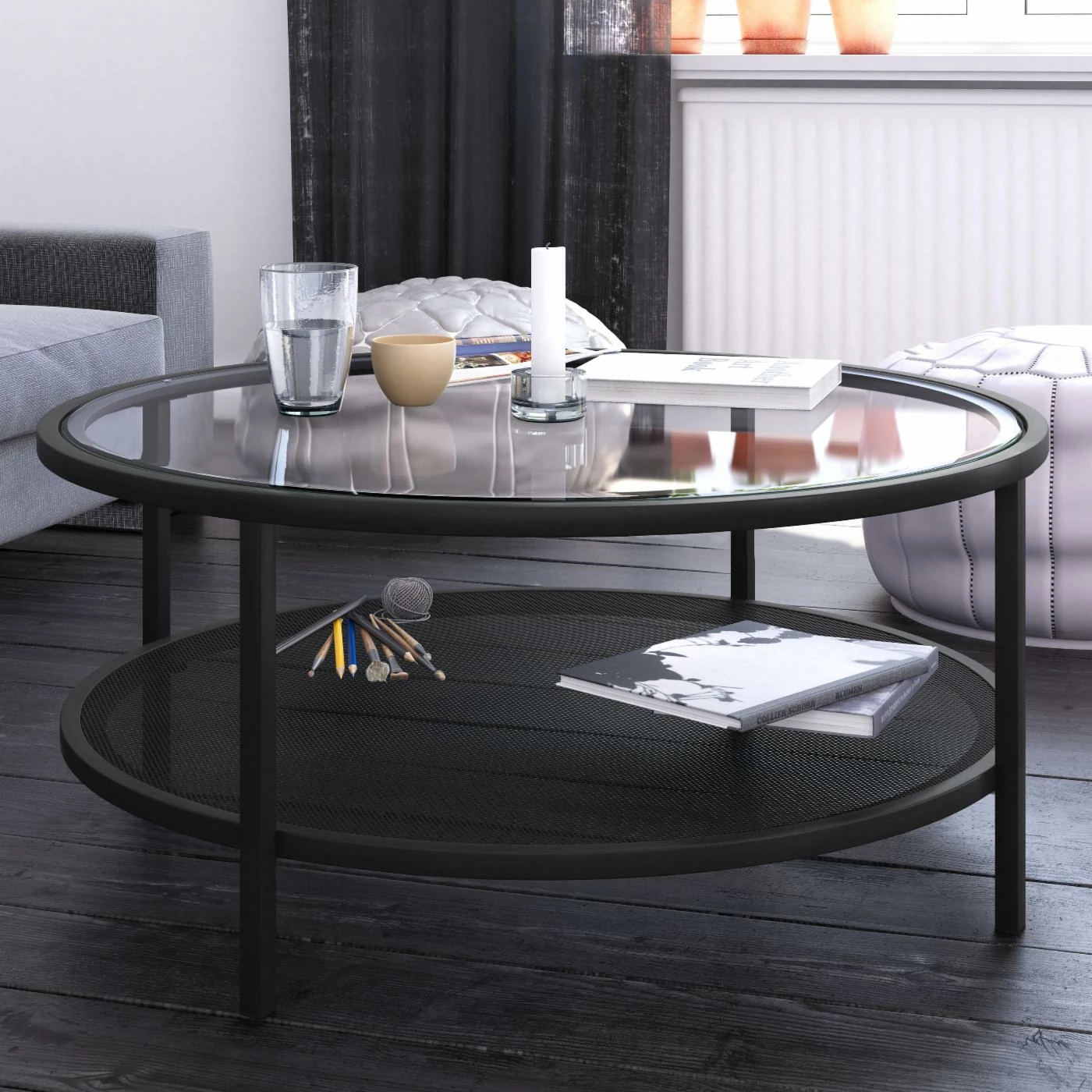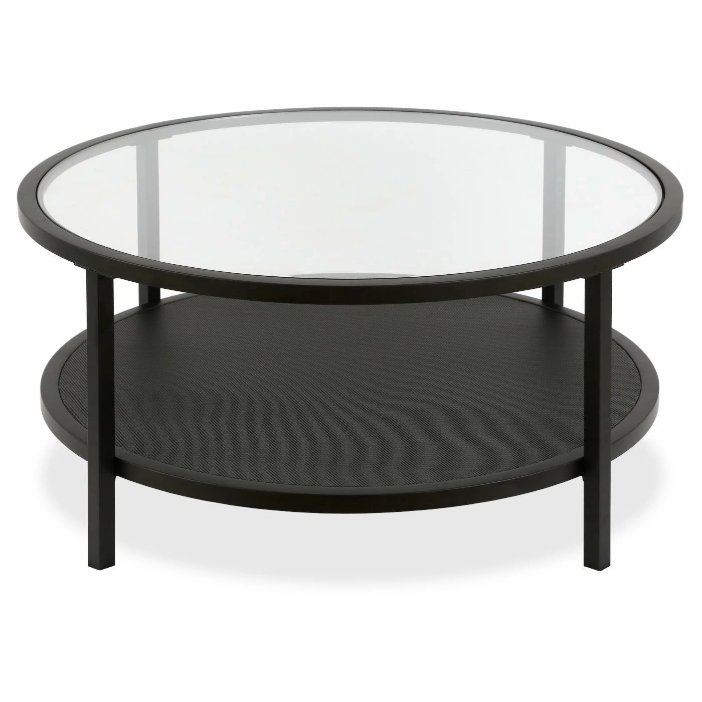 Make sure your new living room is appropriately suited for the modern age with the Hudson & Canal Rigan Round Coffee Table. This round coffee table offers a fetching, streamlined look with sharp lines and bold colors. Its round top features a clear piece of inset tempered glass and rests above a metal lower shelf. The frame is built with steel and perched on block legs. A dark matte black accents the frame.