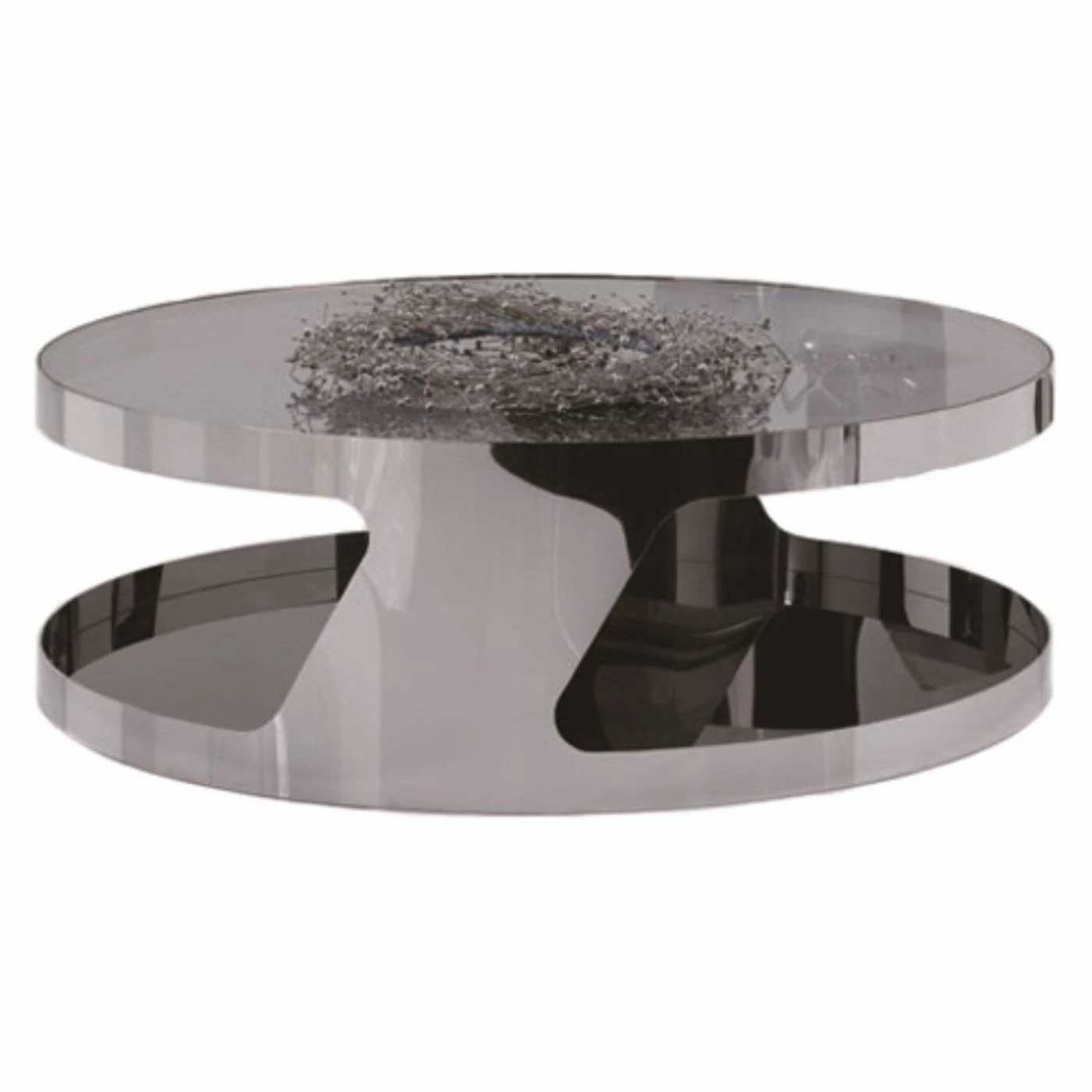 The J & M Furniture 931E Coffee Table will transform the style of your home like a table-sized tornado of shiny chrome. This simple piece has a round frame of metal with a single sheet of tempered glass set into the top of the frame. The tempered glass is tough enough for everyday use, and the black finish of the glass gives it a chic touch. The polished chrome finish adds light and motion to your space while reflecting the style around it. This style is offered in a number of different shapes and sizes, so if it appeals to you, we recommend checking out the other pieces and creating a set for your home.