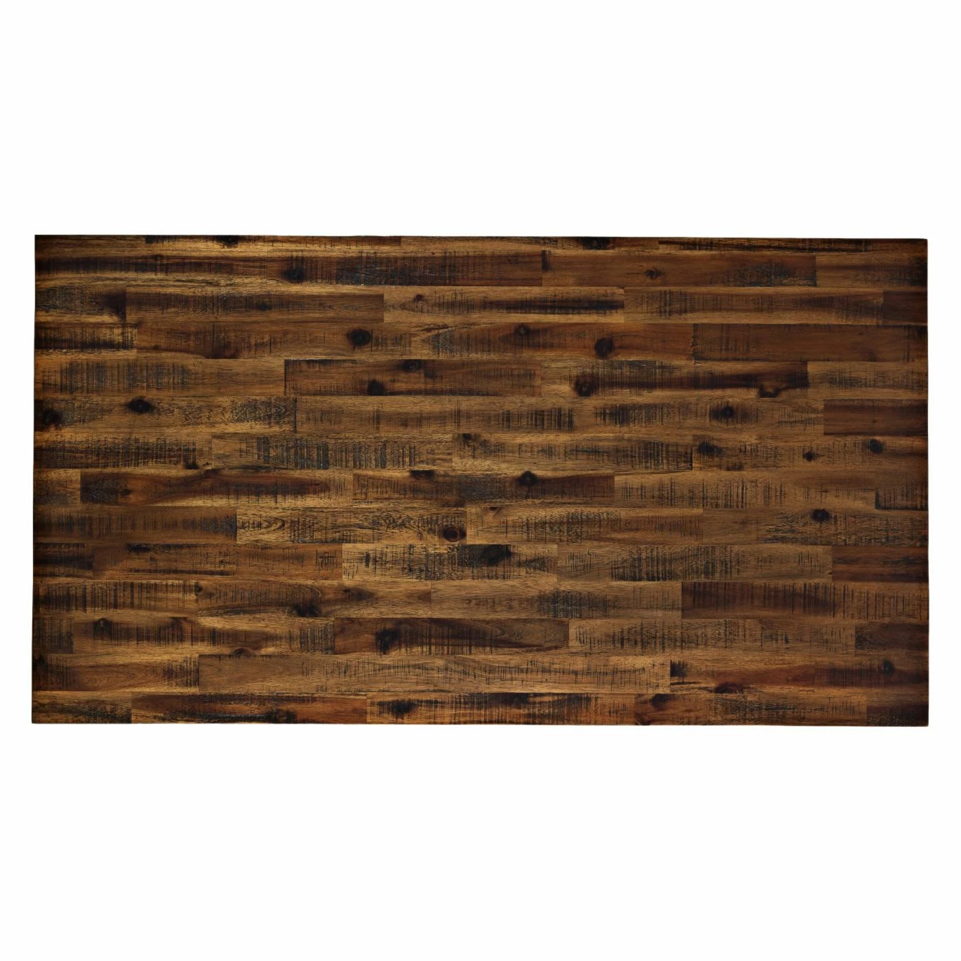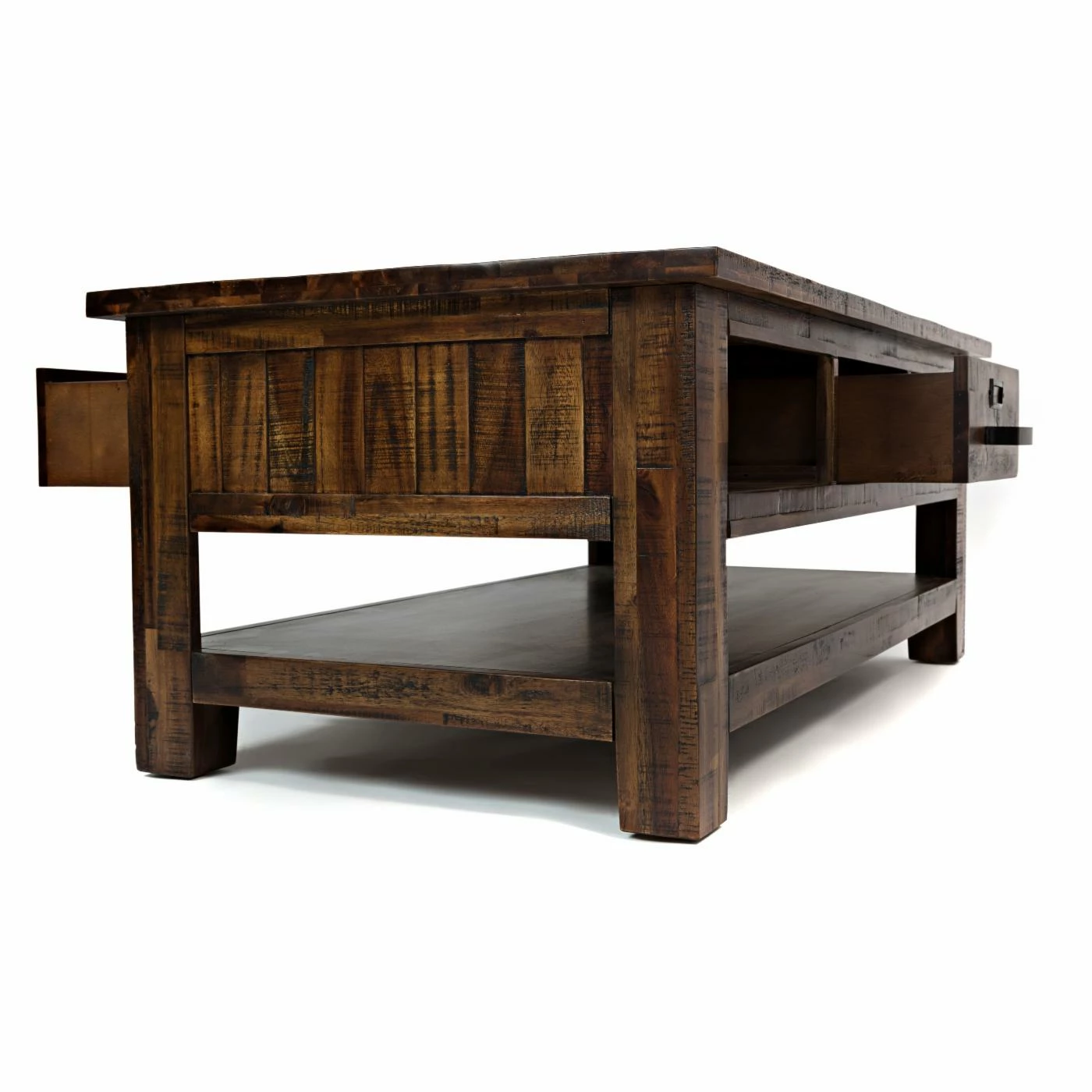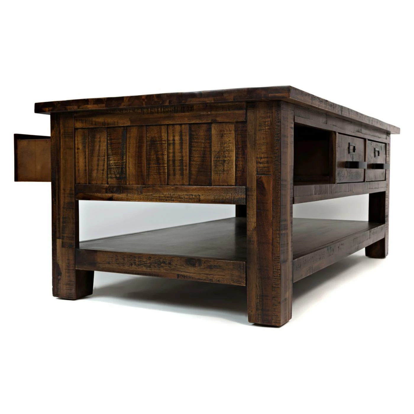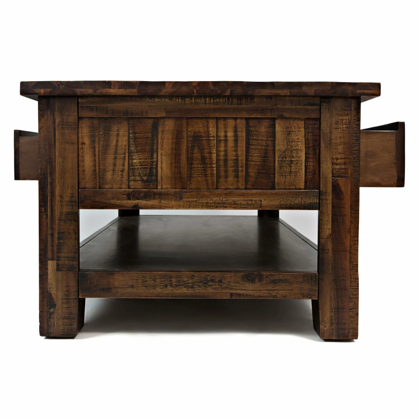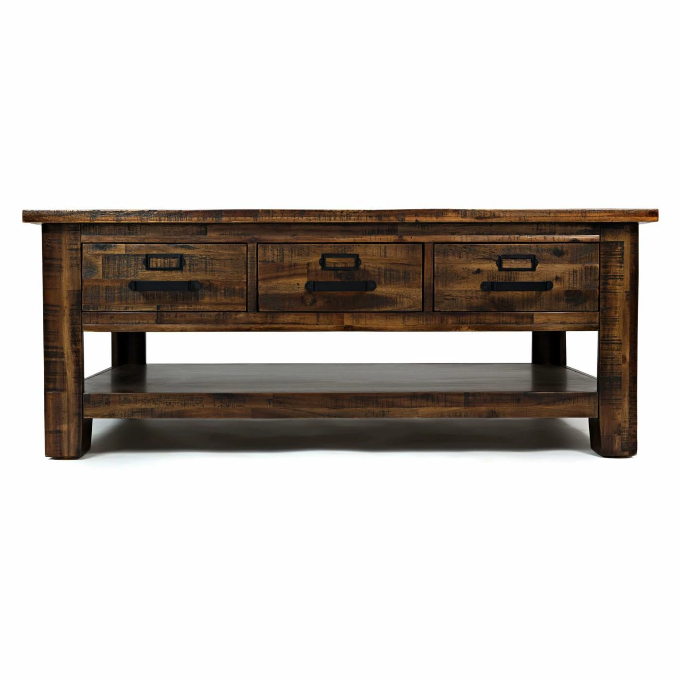 The heritage design of this Cannon Valley Three Drawer Cocktail Table is thoroughly distressed and boasts industrial touches. This cocktail table is made of acacia solids and veneers in a distressed medium finish that allows the wood grain to shine through. Six drawers include three on either side and all feature industrial black metal hardware and a base shelf doubles the display space. Hidden casters make this cocktail table mobile.