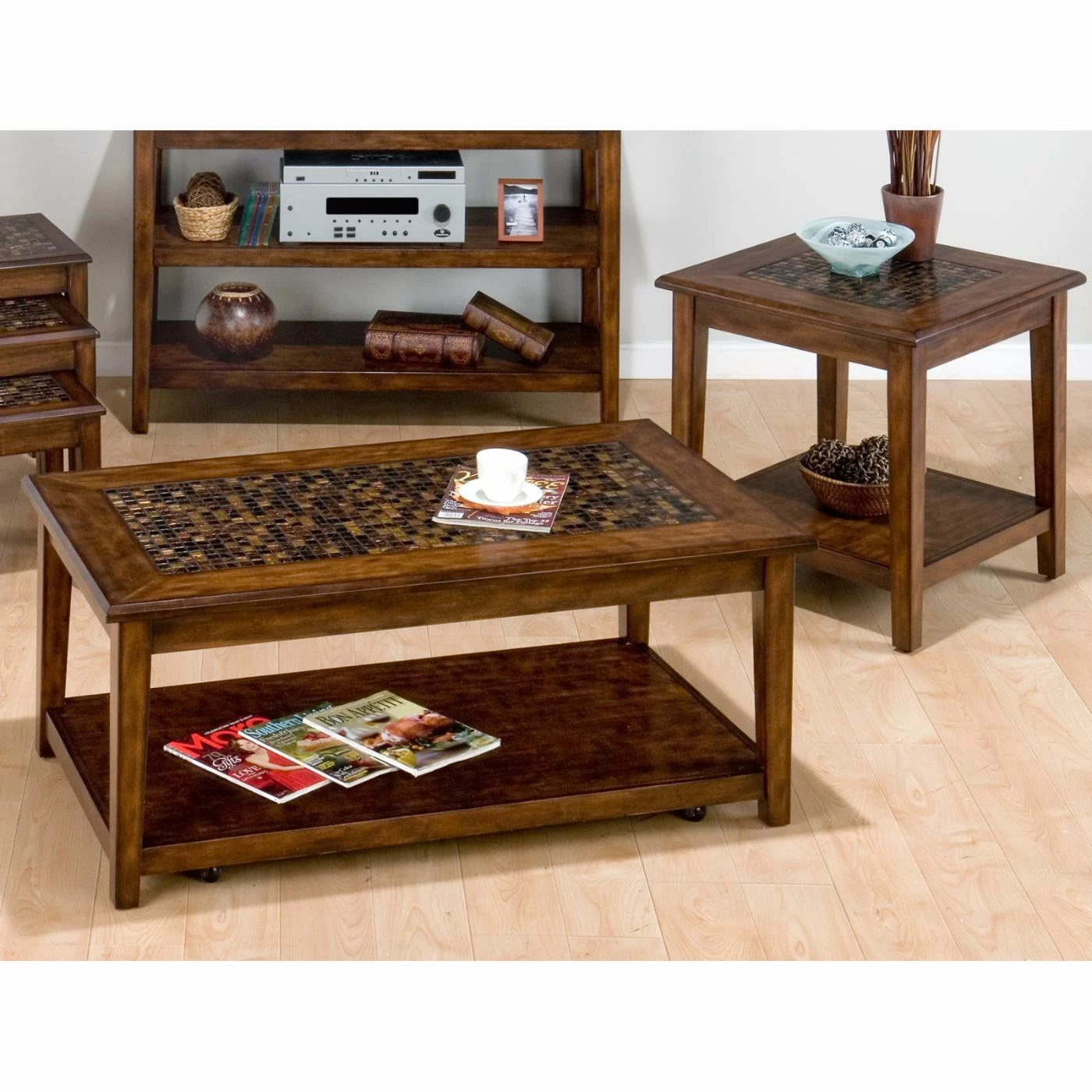 You’ll create your own family traditions amid the pieces of the traditional Jofran Baroque Brown Rectangular 3 Piece Coffee Table Set. This three-piece ensemble, including a coffee and two end tables, boasts straight, understated lines finished in a warm brown shade. Crafted with durable solid Asian hardwood, the tables each have a framed top that gets interest from multicolored mosaic tile, and below, wide open shelves offer storage and display space. At the base of each table, hidden casters make for easy movement and positioning.