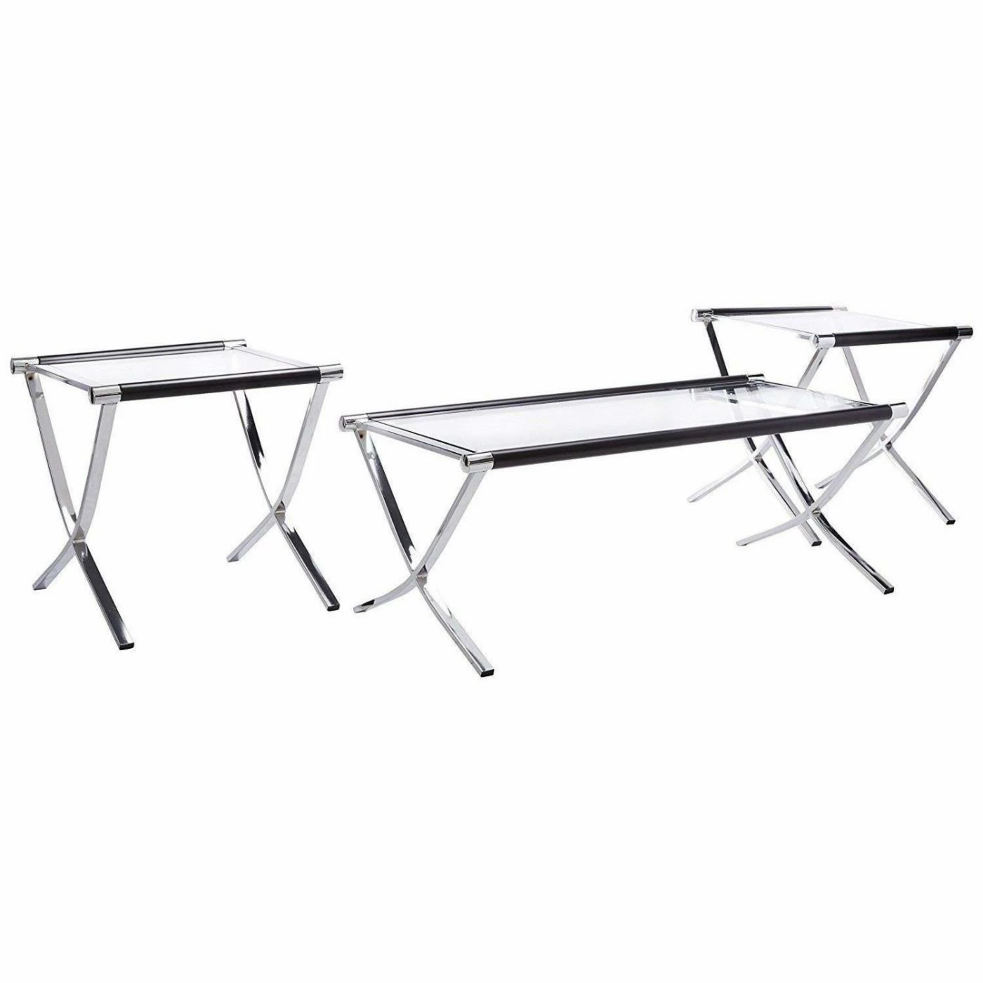 The distinctive K & B Furniture T210 3 Piece Cocktail and End Table Set will enhance your living area. Showcasing clear tempered glass tops, each piece offers an airy, uncluttered look. The curvy, crisscrossed base adds eye-catching appeal.