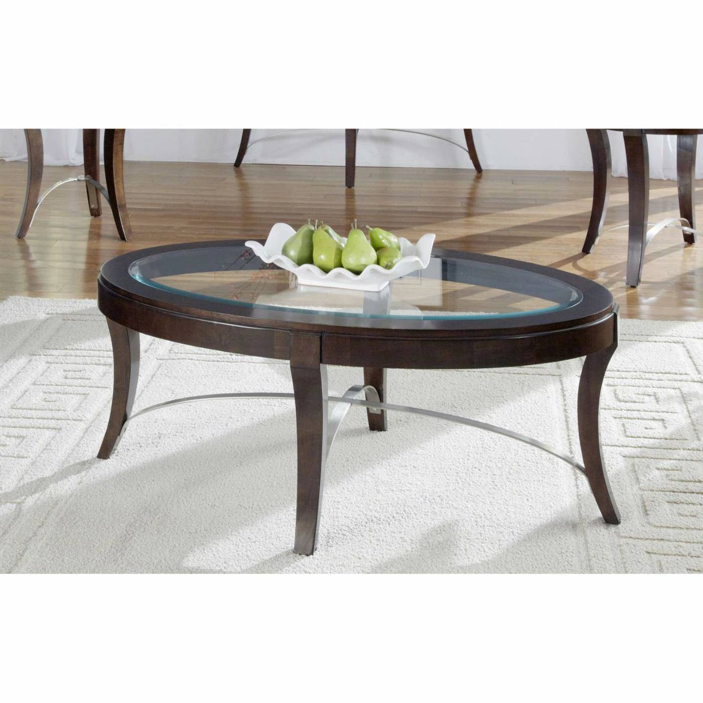 With a wood-framed glass tabletop, the Avalon Oval Coffee Table β Dark Truffle brings elegance and light to your living room seating area. The contemporary curved legs intersect with eye-catching nickel-plated stretchers to create a chic, modern look sure to update your space. The poplar and pine construction is highly sturdy, and the dark truffle finish lends a touch of elegance to your home.