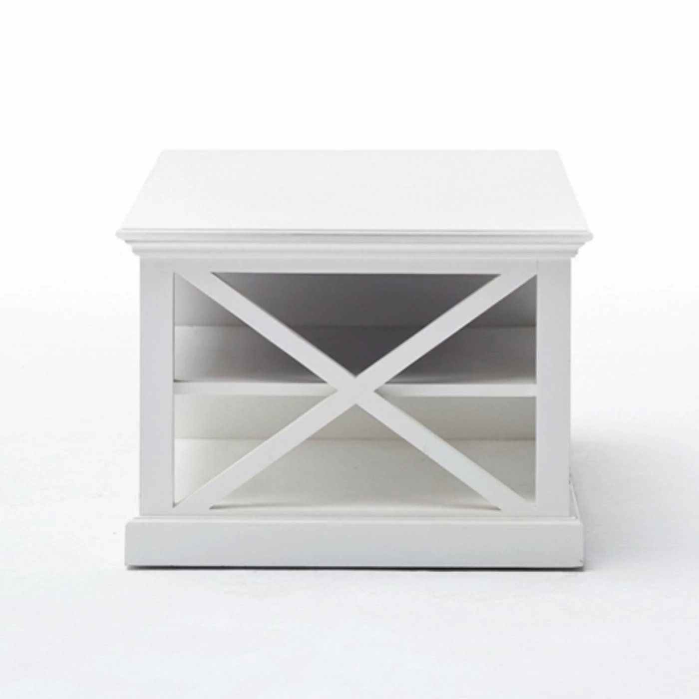 Create a cozy conversation space around this traditional NovaSolo Coffee Table. This pure white, semi-gloss finished coffee table offers three open shelves and a large tabletop for displaying photography books, knickknacks, and flowers. X-shaped detailing adds some country charm to this classic mahogany coffee table.