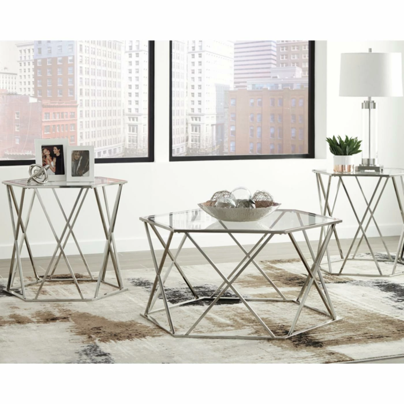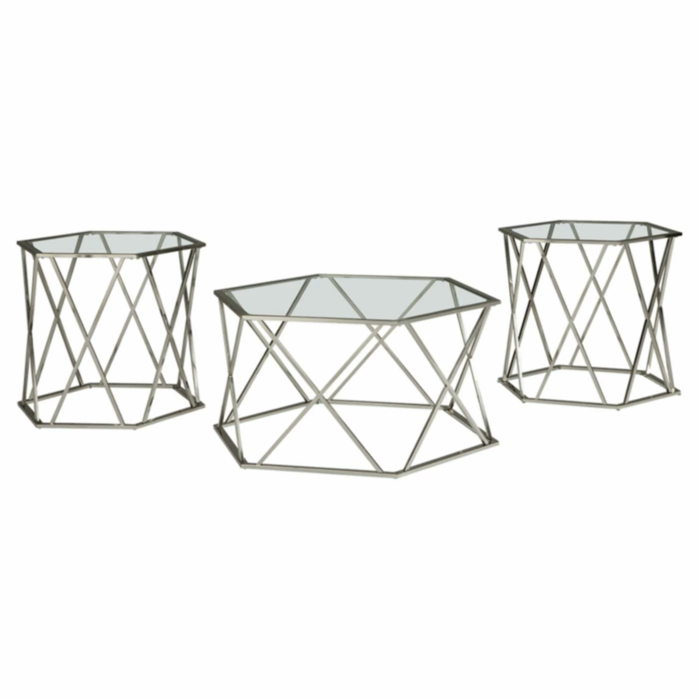 Bring plenty of shine to your contemporary seating area with the Signature Design by Ashley Madanere 3 Piece Occasional Table Set. The coffee table and pair of end tables feature geometric bases crafted out of gleaming chromed steel. Sleek, shatter-resistant tempered glass provides a clear view of the crisscross openwork tubing below.