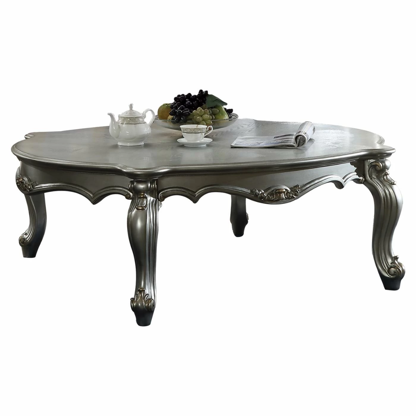 Carved details on the shimmering silver Acme Furniture Picardy Antique Platinum Coffee Table are highlighted in a metallic gold accent finish. A shaped top, carved apron, and Queen Anne legs give this coffee table its baroque appeal. Complete your living room set-up by looking for other pieces in the Picardy collection.