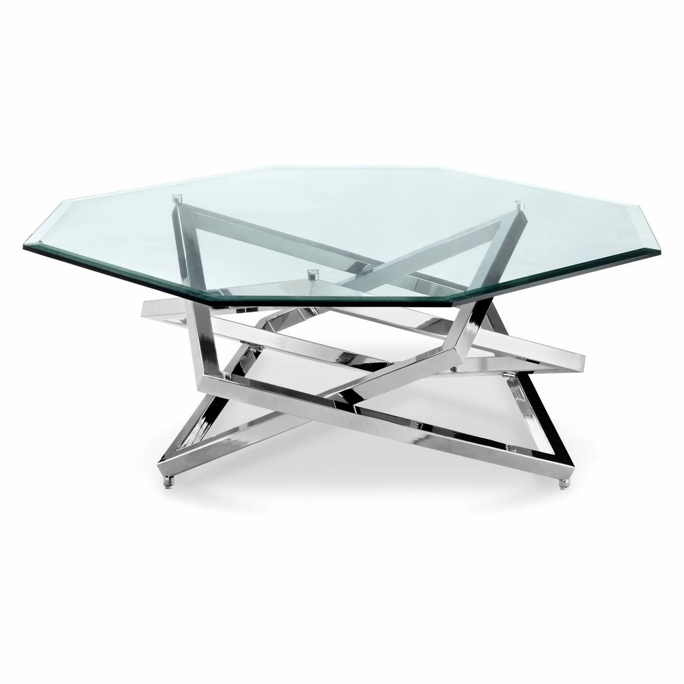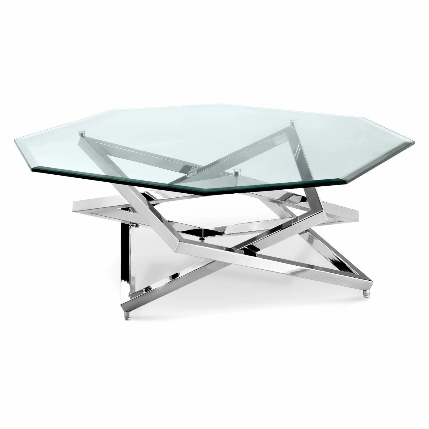 Guests are sure to flock to this shining Magnussen T3790 Lenox Square Octagonal Cocktail Table. Not to be overlooked because of its artsy design, however, the Lenox cocktail table features a sturdy, tempered glass top that is twelve millimeters thick and includes a one-inch bevel. That makes this table the real deal – strong enough to handle the weight of the occasion, whether thatβs cocktails with friends or a quiet dinner in front of the television. The tableβs most obvious feature is its offset, intermingled square base, which is constructed of chrome-plated nickel and serves as the pedestal to the octagonal tabletop.