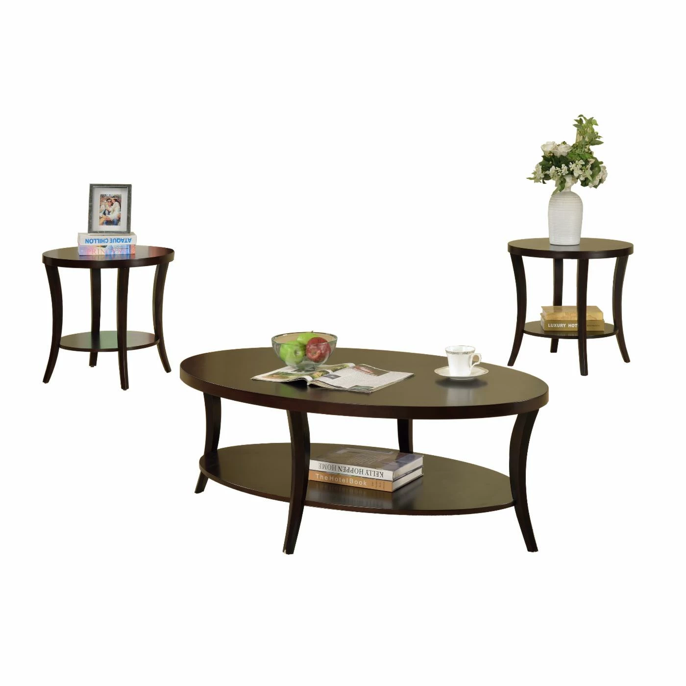 Curved legs and rounded edges make the Crown Mark Rhonda 3 Piece Cocktail Table Set a sophisticated set for your home. This set includes a cocktail table and two end tables finished in a rich espresso. The round and oval tabletops are spacious enough for all of your lamps, books, and picture frames. The three poplar wood pieces feature a bottom shelf which provides you with even more space to decorate and organize.
