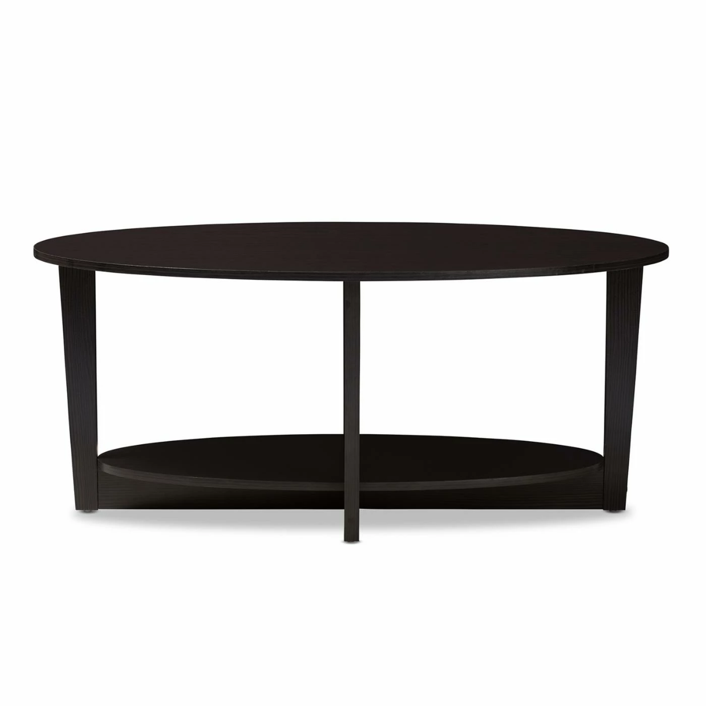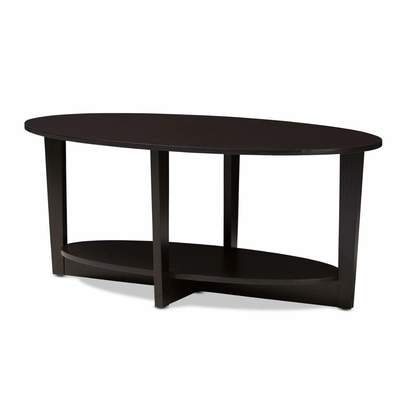 The Baxton Studio Jacintha Oval Coffee Table wows with its streamlined, clean aesthetic. It boasts engineered wood craftsmanship for enduring beauty. The dark espresso finish lends a rich touch. This coffee table is complete with a spacious bottom shelf for impressive storage.