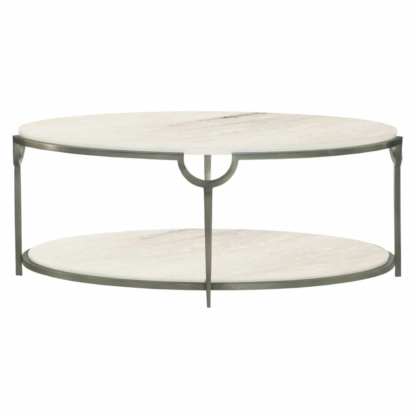 An oval shape makes the Bernhardt Morello Oval Metal Cocktail Table an elegant addition to your glam living room or sitting area. This shape fits well with formal living room configurations. Designer details of this cocktail table include a white faux Carrara marble top and lower shelf for double the display space. It’s supported by slim steel legs and banding. An oxidized nickel finish that simply curved tops add detail to the frame of this cocktail table. Design your own cohesive chic living room by looking for companion pieces in the Morello collection.