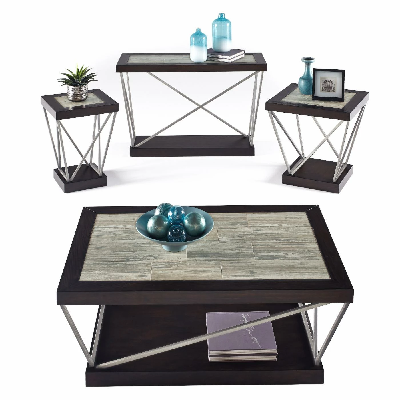 Have fun with your interior design with the contemporary Progressive East Bay Rectangular Cocktail Table. This dynamic centerpiece features a unique blend of premium-quality materials and distinctive shapes that will give your favorite gathering space a bold new look. This sleek and practical table features a 2-inch thick rectangular top with ceramic tile inlays in whites, grays, and tans surrounded by a solid black poplar border. The top is supported by angular metal legs in a muted soft pewter color, and its base is yet another black poplar surface that serves as an open shelf which also hides smooth-rolling caster wheels.
