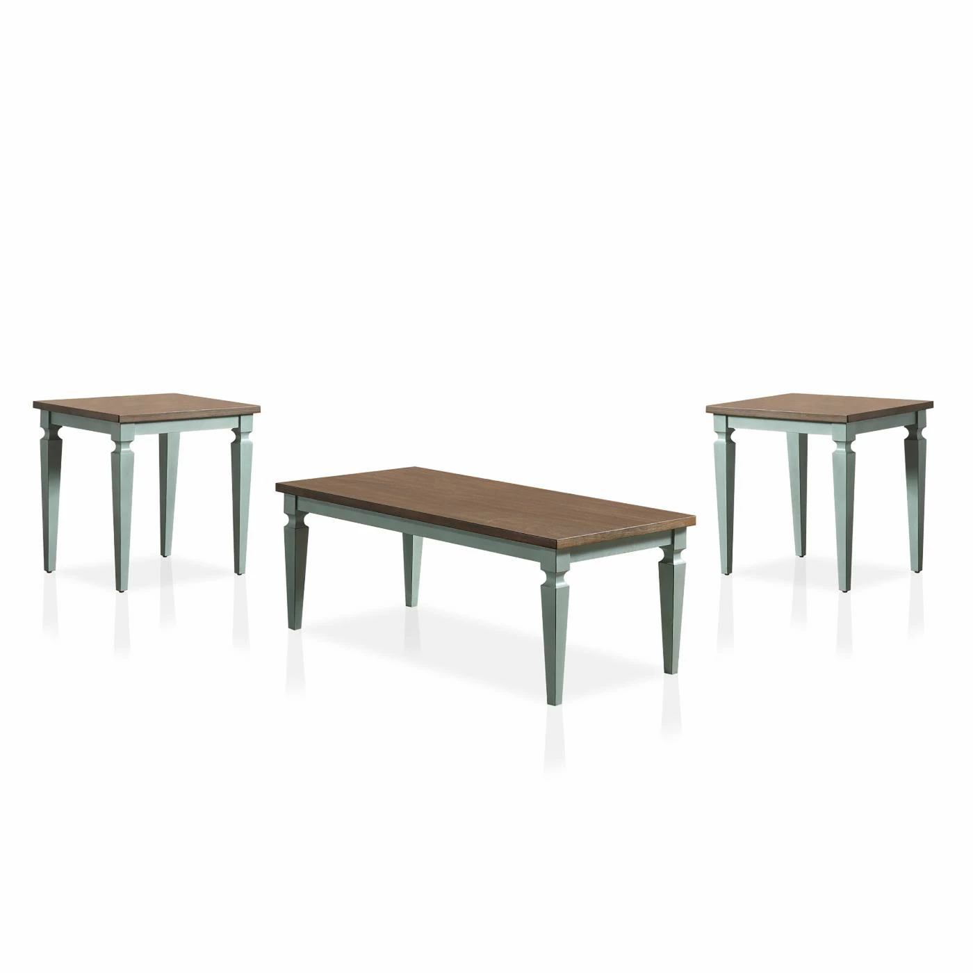 This vintage Furniture of America Alphara 3 Piece Transitional Coffee Table Set is the perfect assortment to create a farmhouse style. The piece is formed by Okoume veneer and decades durable acacia wood. The tables are poised on tapered legs come in a finish of antique blue with oak tabletops.