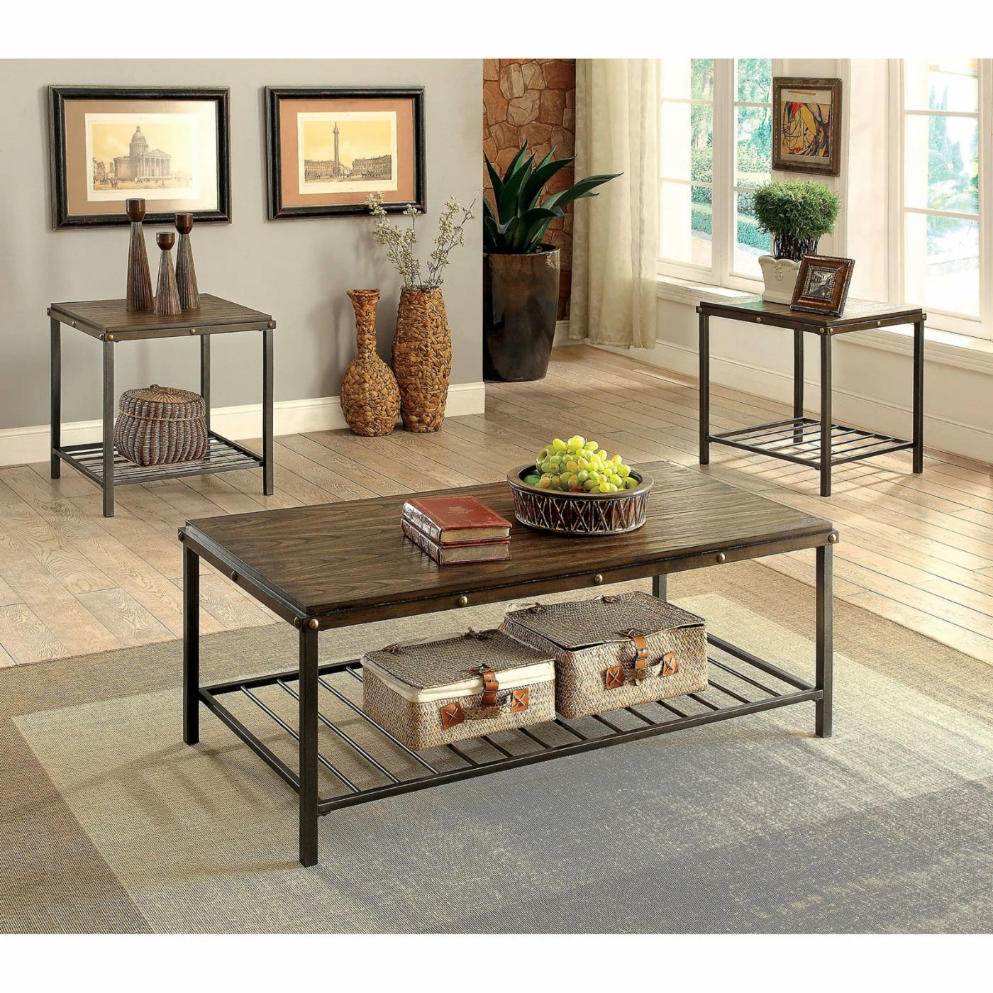 This Furniture of America Poe 3 Piece Coffee Table Set boasts quality wood veneer and metal craftsmanship that’s sure to look great in any home. Supported by durable metals frame and sturdy block legs, each one is finished in alluring dark oak. They are also equipped with a slatted open shelf for stylish storage of books and magazines.