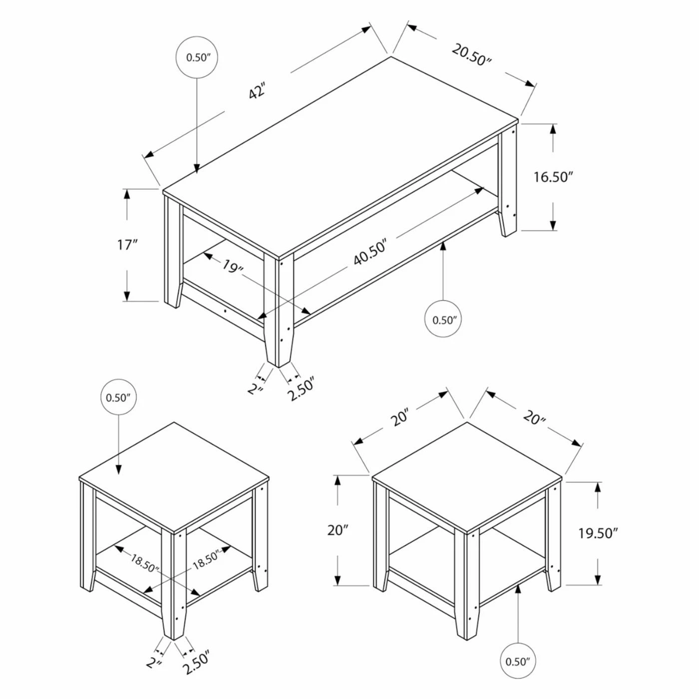 Use the shelves to display your favorite coffee table books or magazines, or to store items that might usually clutter up your living room. Choose from available finishes to find the Monarch Specialties 3 Piece Occasional Table Set with Shelf that works best for your home.