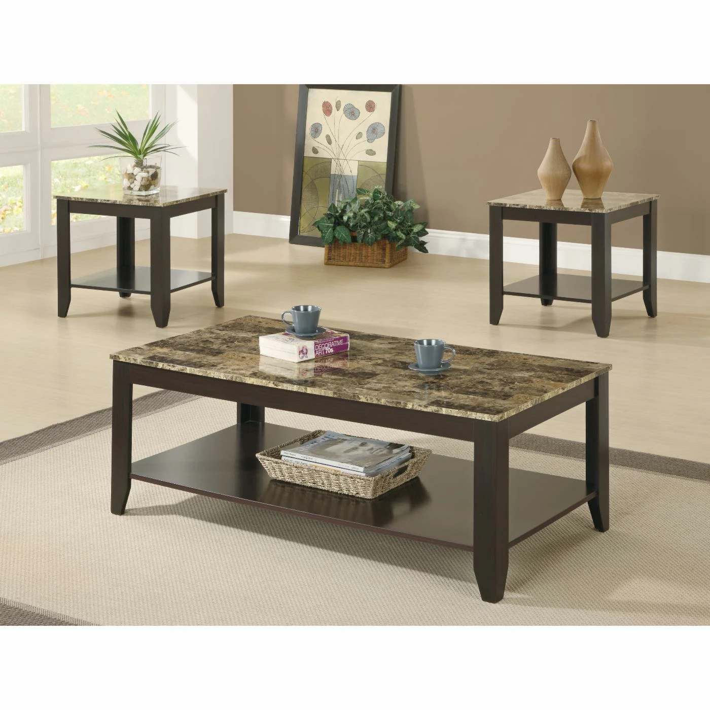 Add some intrigue to your living room décor with the Monarch Specialties Cappuccino 3 Piece Coffee Table Set with Faux Marble Top. This stylish set features one coffee table and two end tables. Each piece is made of MDF wood with cappuccino finishes. The table tops have eye-catching faux marble in shades of brown. The tables also include a bottom shelf for added storage space.