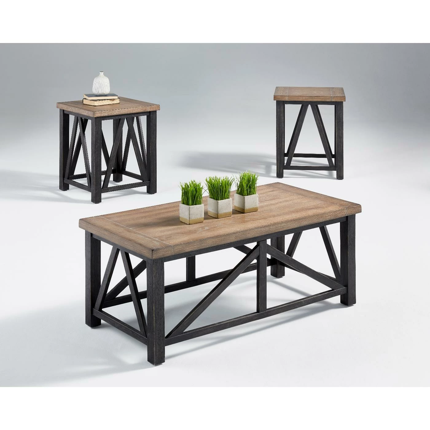 - Includes 1 cocktail table and 2 end tables