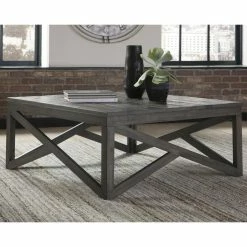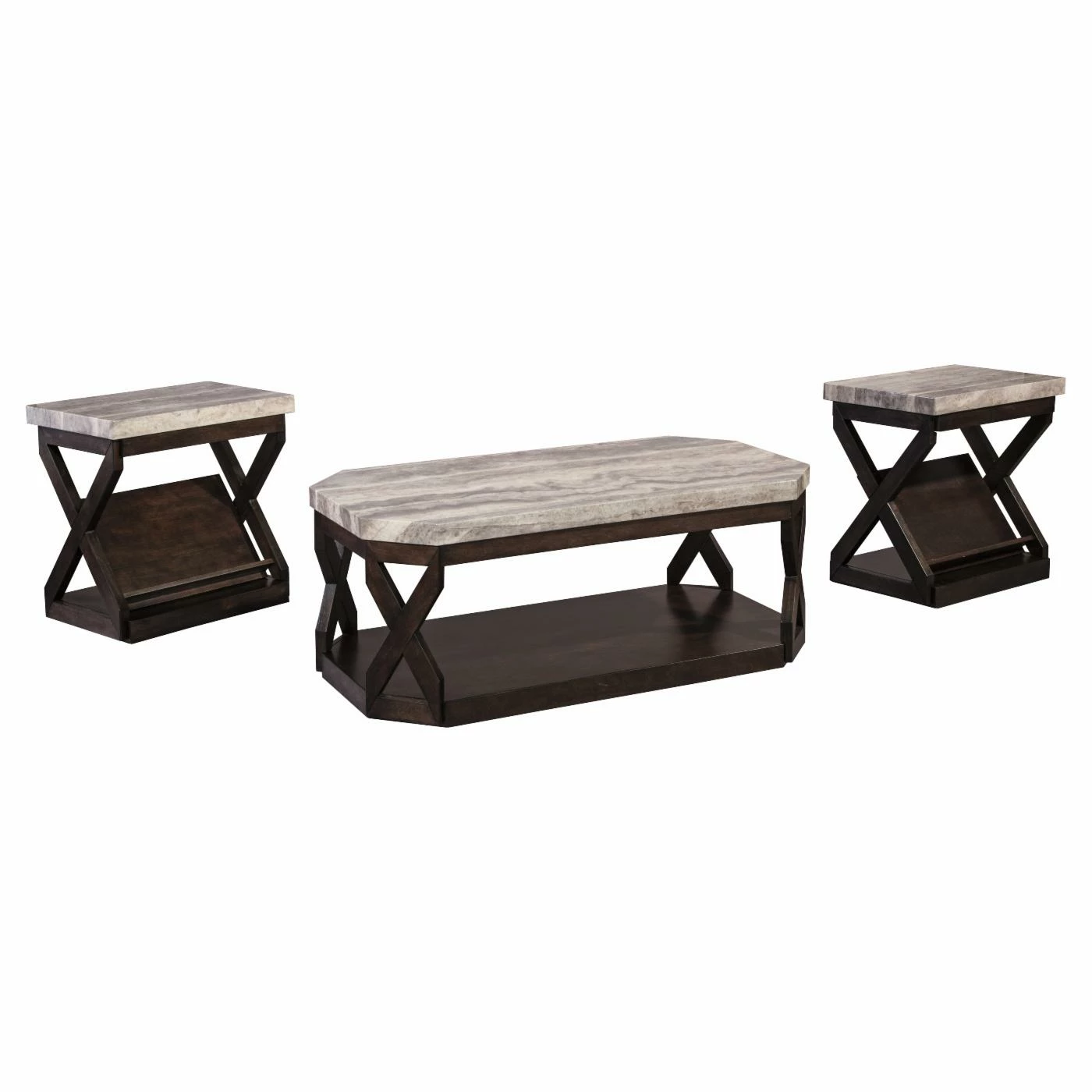 X-shaped frames give this Signature Design by Ashley Radilyn 3 Piece Coffee Table Set its bold, contemporary style. This set includes one coffee table and two matching end tables. Each boasts a print gray travertine patterned paper top with glossy polyurethane finish. Frames are made of hardwood solids and select veneers in a versatile gray brown finish. The coffee table features canted corners and a generous base shelf. The two end tables feature handy magazine racks.