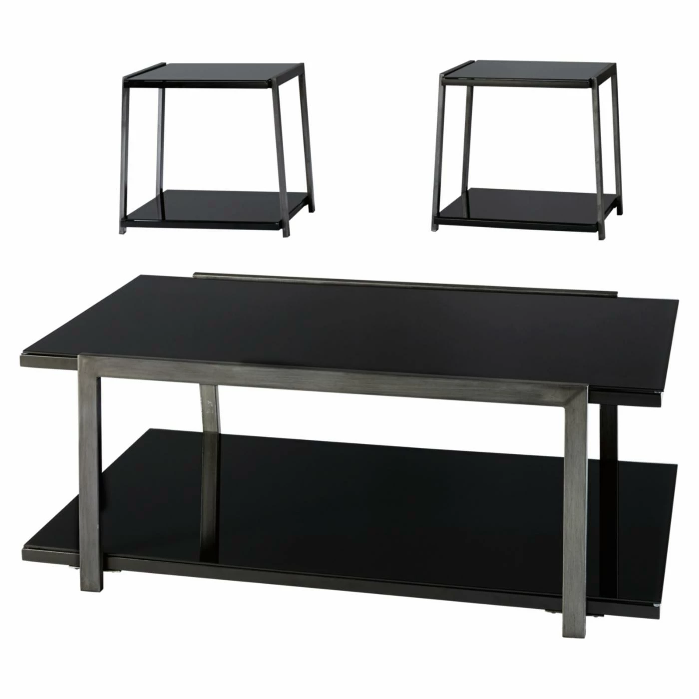Refresh your dΓ©cor with the contemporary design of the Signature Design by Ashley Rollynx 3 Piece Occasional Table Set. Understated, aged silver metal frames make the coffee table and two end tables sleek and sturdy. Black tempered glass tops and matching lower shelves heighten the mod appeal of the tables.