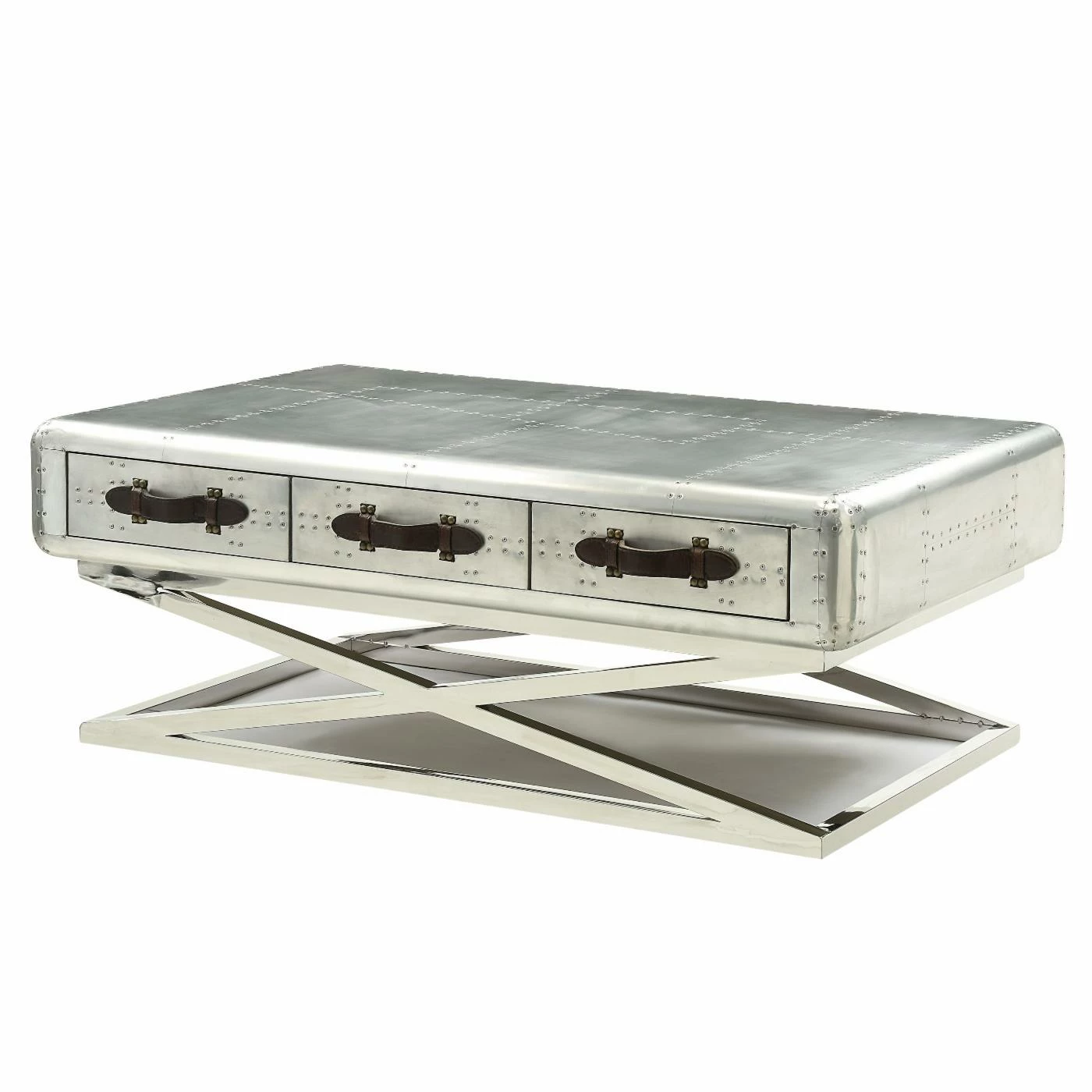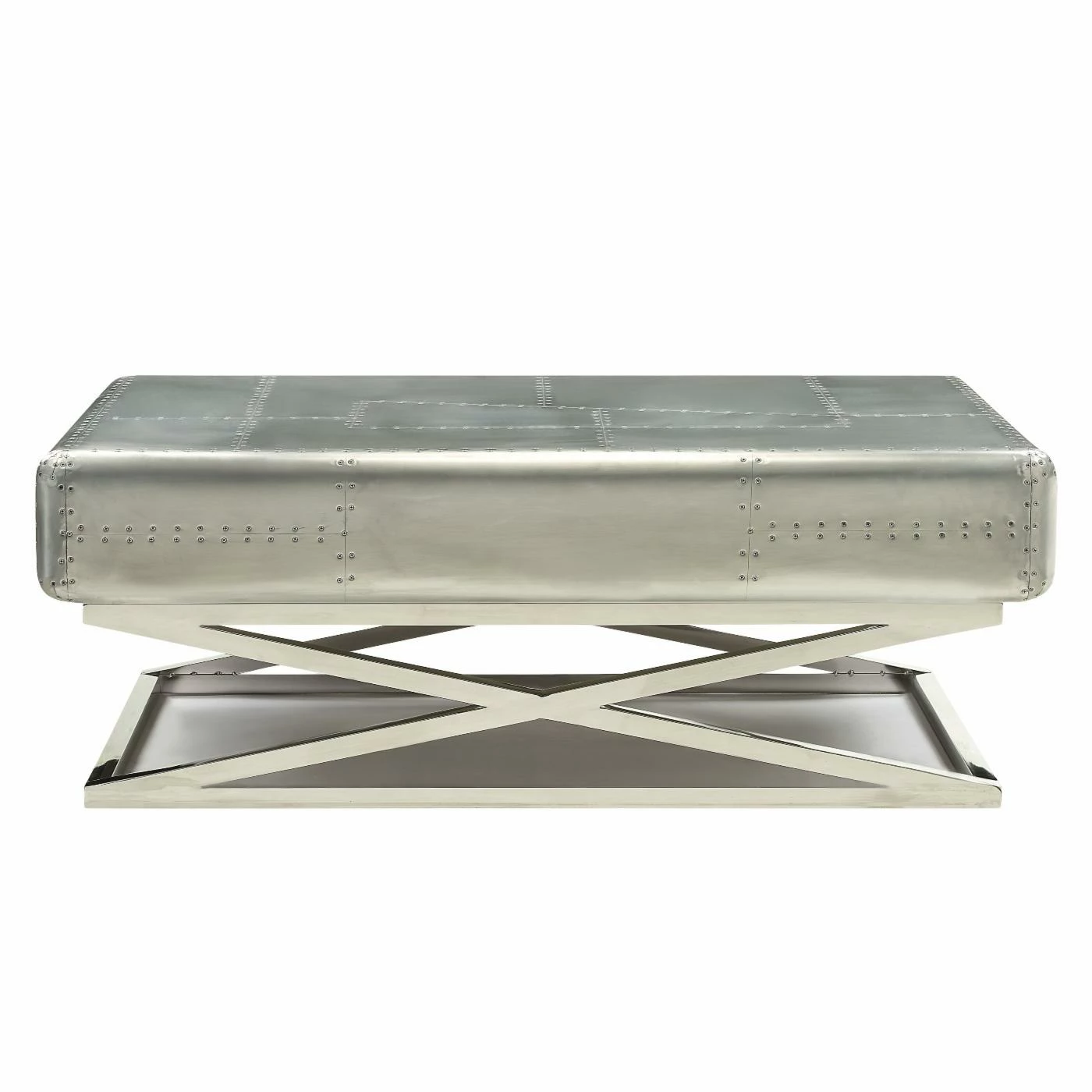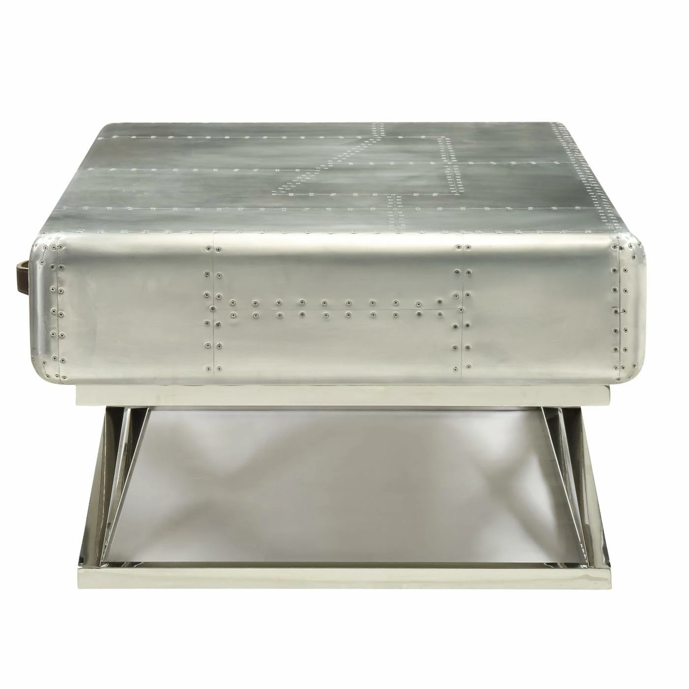 The Acme Furniture Aberdeen II Coffee Table combines vintage and industrial inspiration by featuring a riveted aluminum exterior and suitcase styling. The three roomy drawers feature top grain leather handles and are fully lined to keep items protected. The smooth metal glides make opening and closing the drawers easy, while the safety stops help prevent pinched fingers. Its distinctive styling is sure to make this fetching and unique coffee table the focal point of the room.
