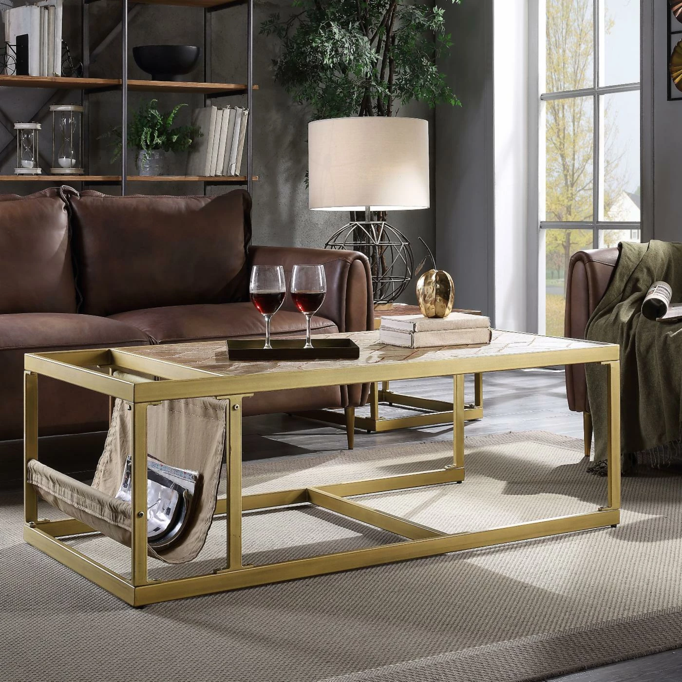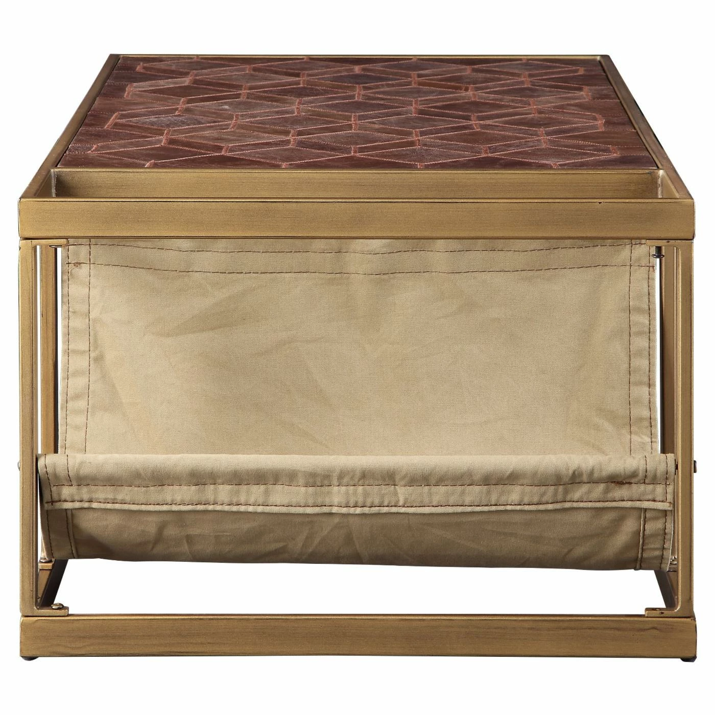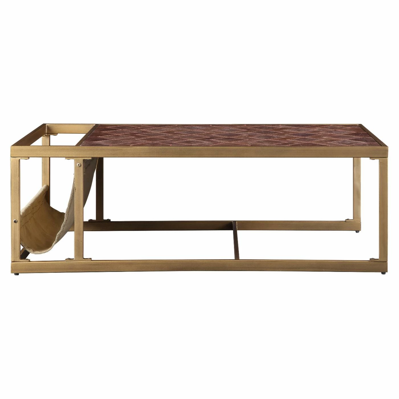 Blending sharp modern lines with handsome rustic materials, the Acme Furniture Genevieve Leather Top Coffee Table is an alluring complement to redesign your living room or dayroom around. Its sled-style base is made from squared metal and finished in a gorgeous brushed brass color. Genuine top-grain brown leather upholsters the tabletop, accented with diamond stitching to add to the hand-made design. An open are in the top affords accent to a fabric sling for books, magazines, newspapers, and more.