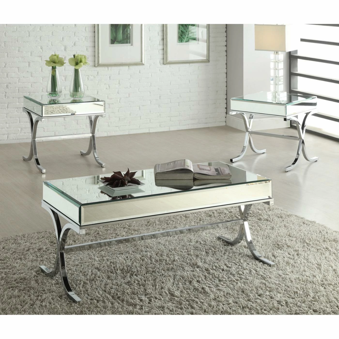 Curved X-shaped side supports lend elegant lines to the Acme Furniture Yuri Mirrored Top and Chrome Coffee Table. Featuring a high-shine, chrome-finished metal tube base, this contemporary coffee table adds a reflective beauty to your home dΓ©cor. Boasting a beveled mirrored top and sides for the ultimate in modern glamour, this piece creates focal-point style in your space.