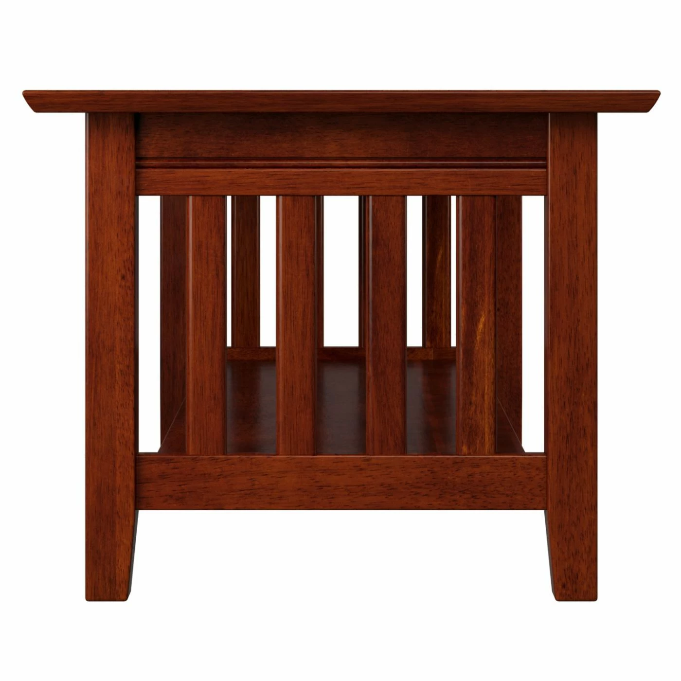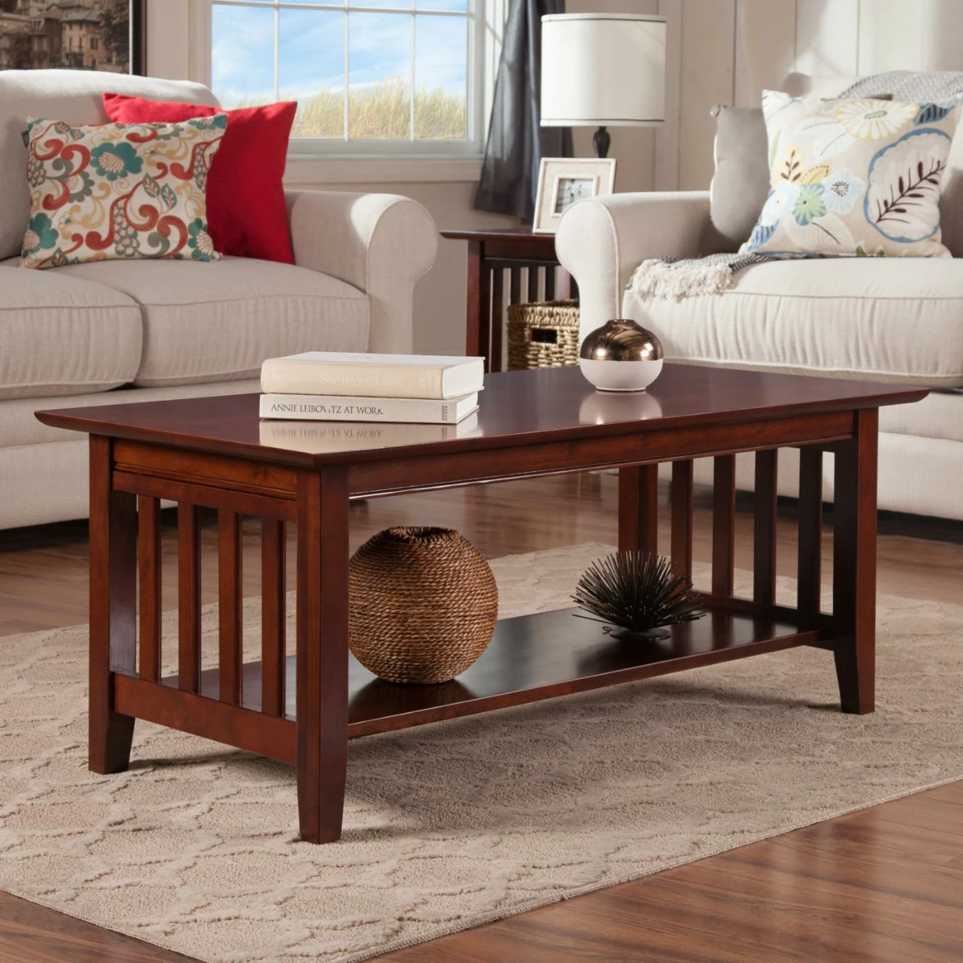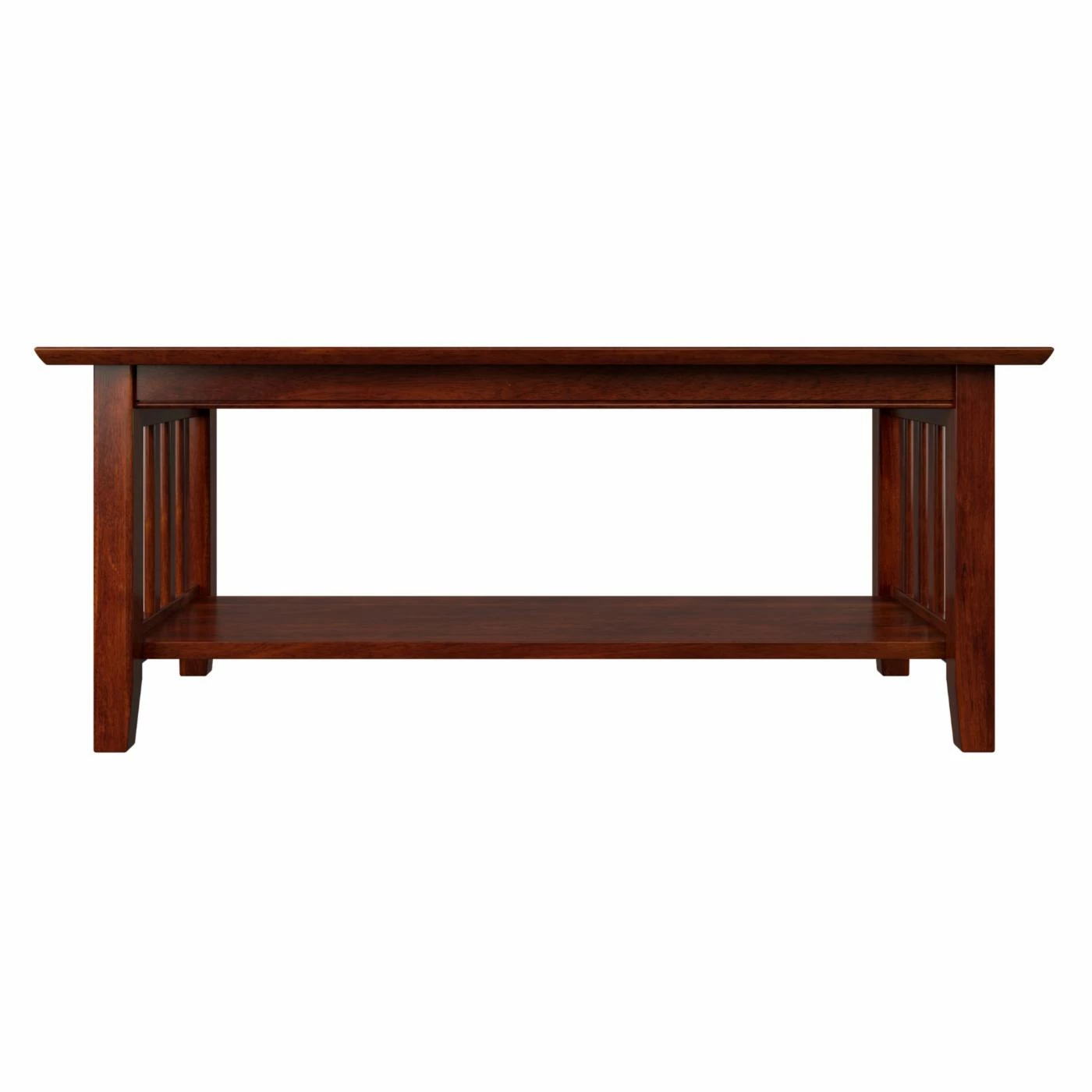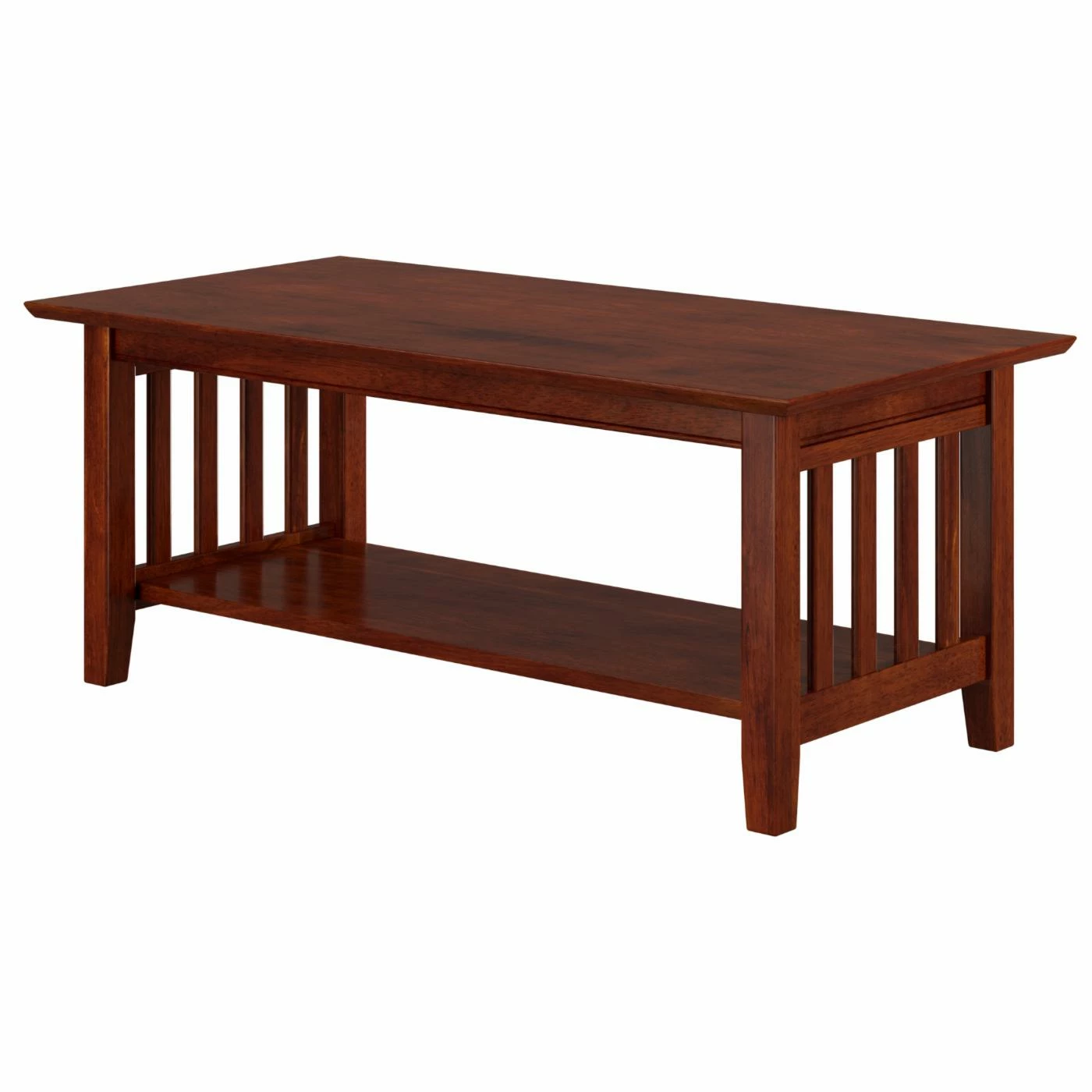 The slatted sides and choice of finish options make this AFI Furnishings Mission Coffee Table a beautiful example of California Craftsman design. This coffee table boasts slatted sides and sturdy, tapered legs for that mission look. A lower shelf offers room for display pieces. This coffee table is crafted of solid, eco-friendly hardwoods.