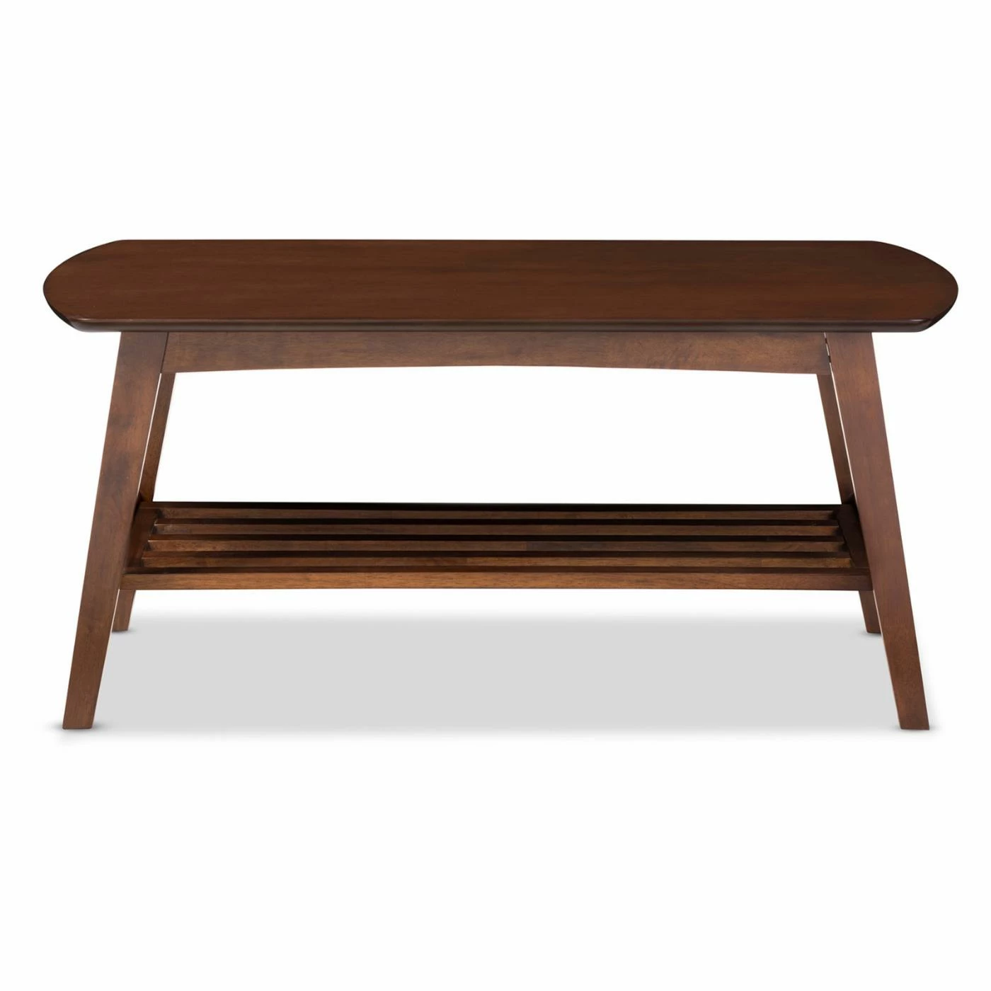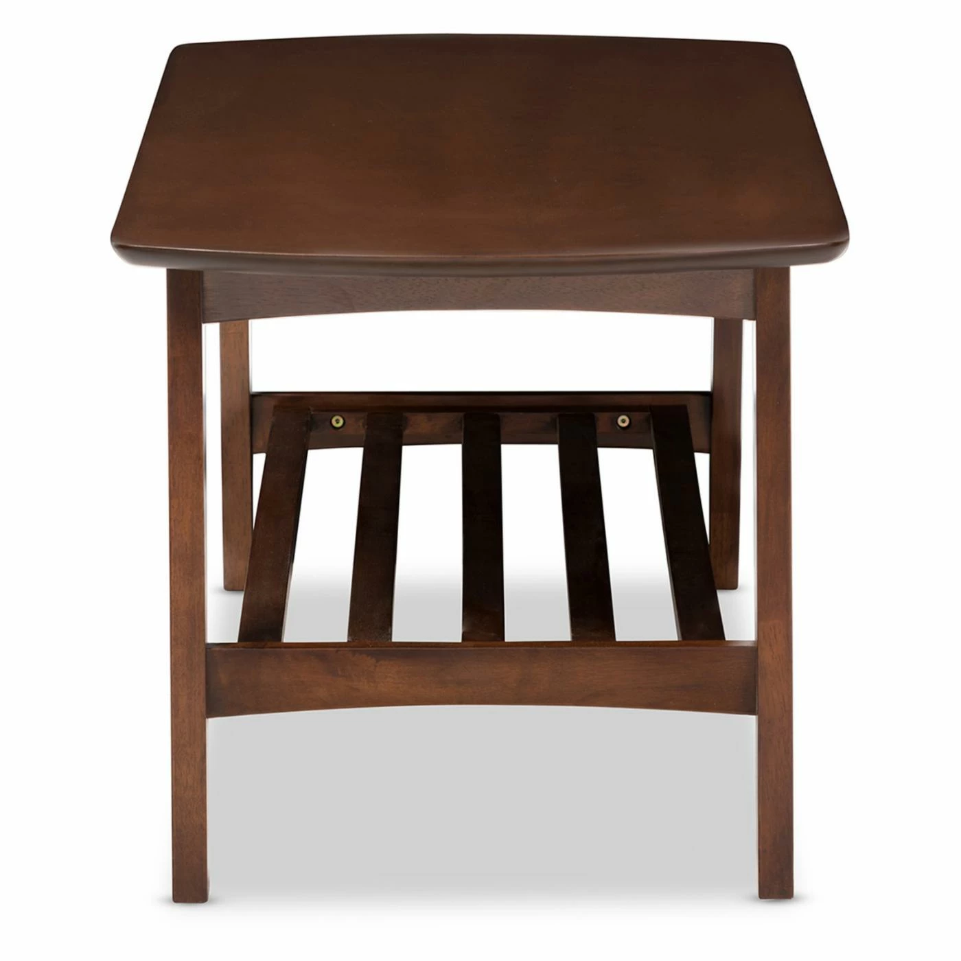 Reflecting the simple elegance of classic Scandinavian style, the Baxton Studio Sacramento Coffee Table is an ideal centerpiece for a minimalist, mid-century, or contemporary seating area. For long-lasting durability and rich, appealing color, the table is fabricated out of solid rubber wood and engineered wood then finished with walnut veneers. A slatted shelf provides convenient storage space for reading materials and board games below the tabletop. You can show this piece off on its own or with the matching console and end tables, sold separately.