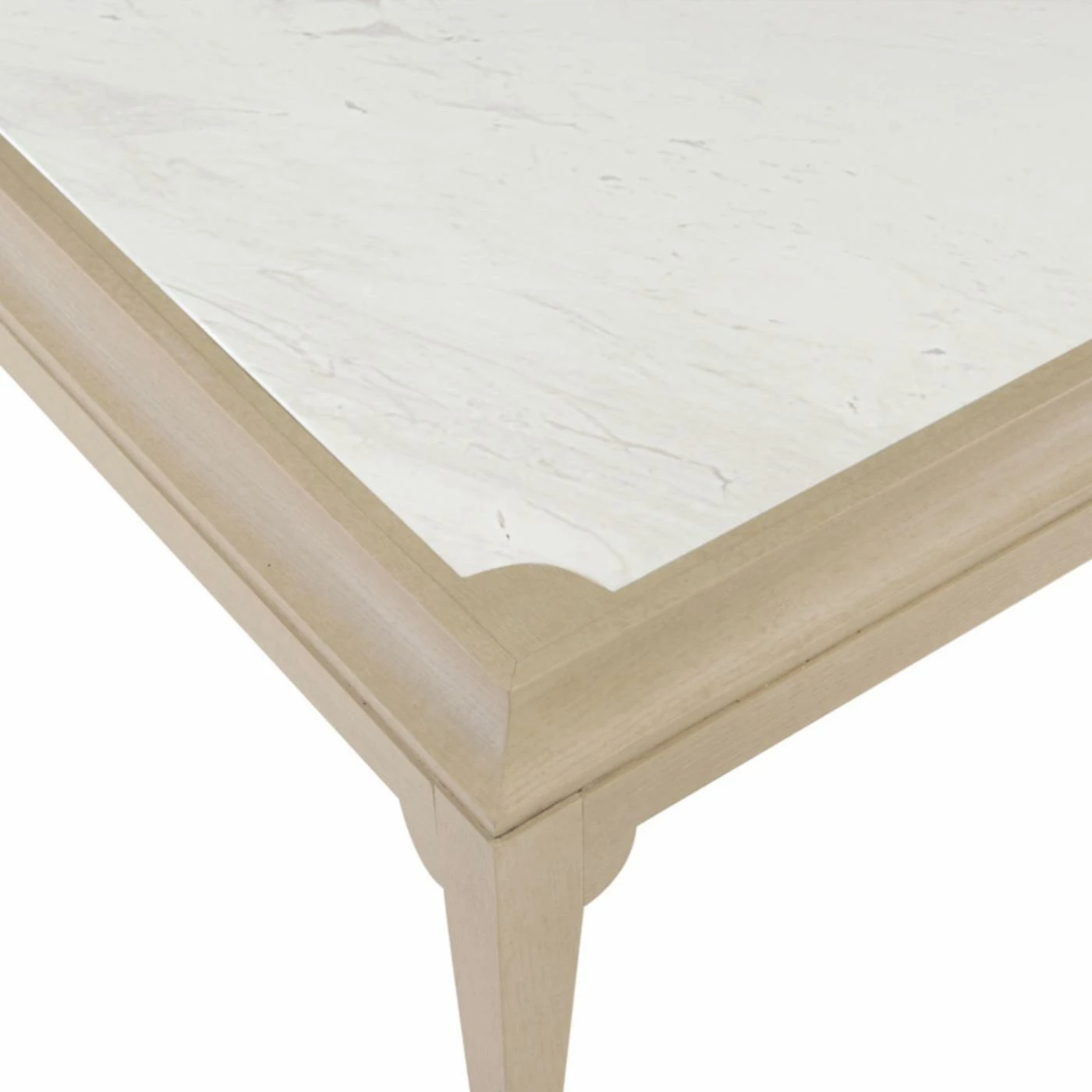 A classic gets glamorous in the neo-traditional Bernhardt Savoy Place Cocktail Table. This cocktail table has a light brown chanterelle finish that feels right at home in any modern living space. Its wood-framed top is inset with honed jazz white laminated stone for a dynamic look. Tapered, flared wood legs are capped in metal ferrules for a modern kick. Search out other pieces in the Savoy line for a cohesive living space with a designer flair.