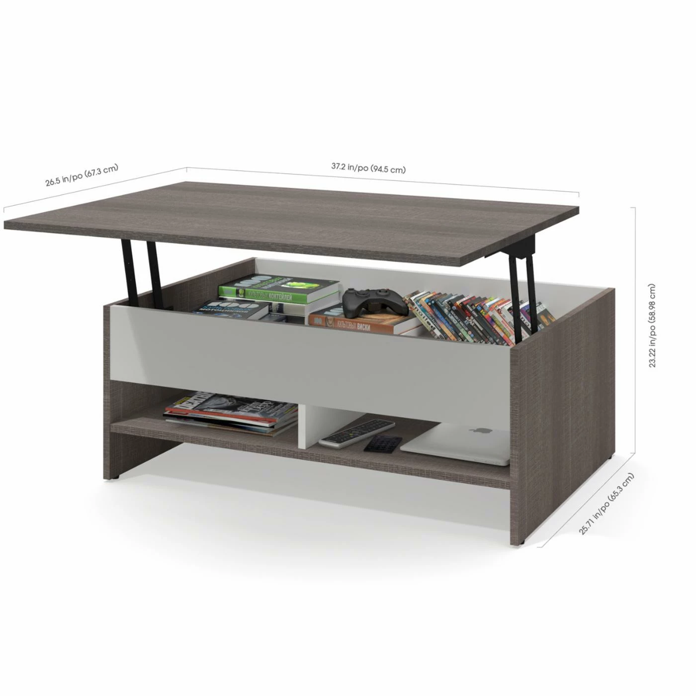 The Bestar Small Space 2 Piece Lift-Top Storage Coffee Table and TV Stand Set is a great solution when your living room is also your dining space and home office. The set includes a lift-top storage coffee table and TV stand built of durable, laminated engineered wood with a melamine finish that resists scratches, stains, and burns. The lift-top coffee table elevates to become a desk or casual dining space and includes open storage inside as well as two open shelves on the exterior. The TV stand has three open shelves, a cupboard door with an adjustable shelf, and two wire management grommets inside. Make this coffee table and TV stand set yours by choosing from the available finish options.