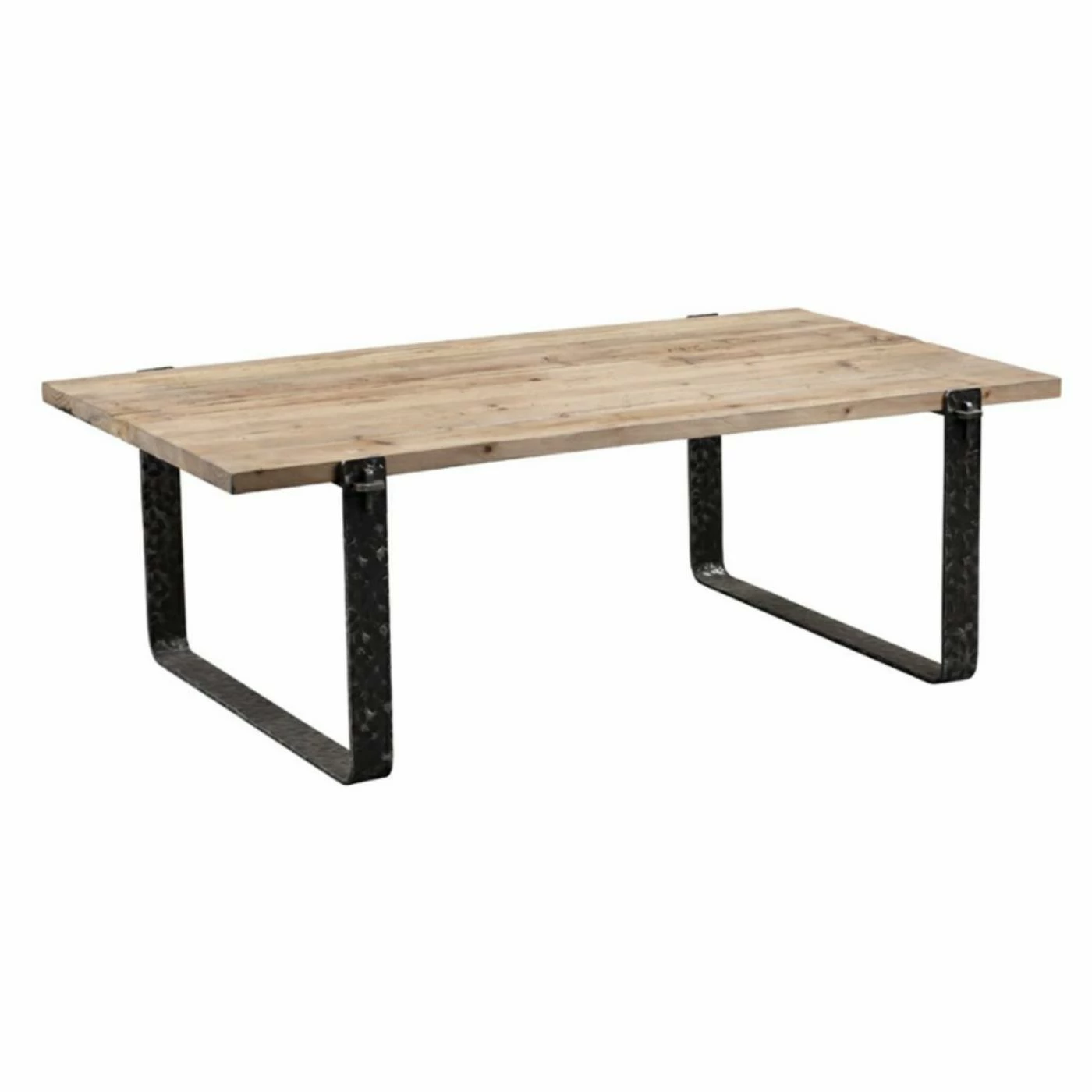 The stripped-down, industrial chic of the Burnham Home Designs Pearson Rectangular Coffee Table is going to be a significant addition to your home’s style. This table features a hardwood top with a distressed, natural finish. A pair of bent stainless steel legs provide rugged support. The hammered black finish of the legs adds a man-made feel that contrasts the organic appearance of the wide top.