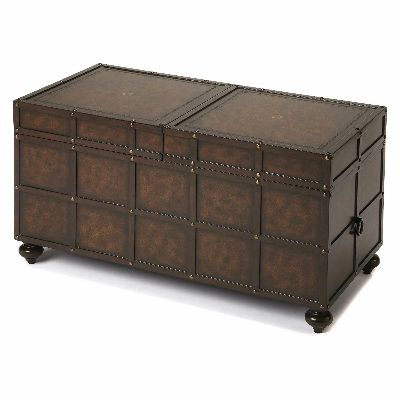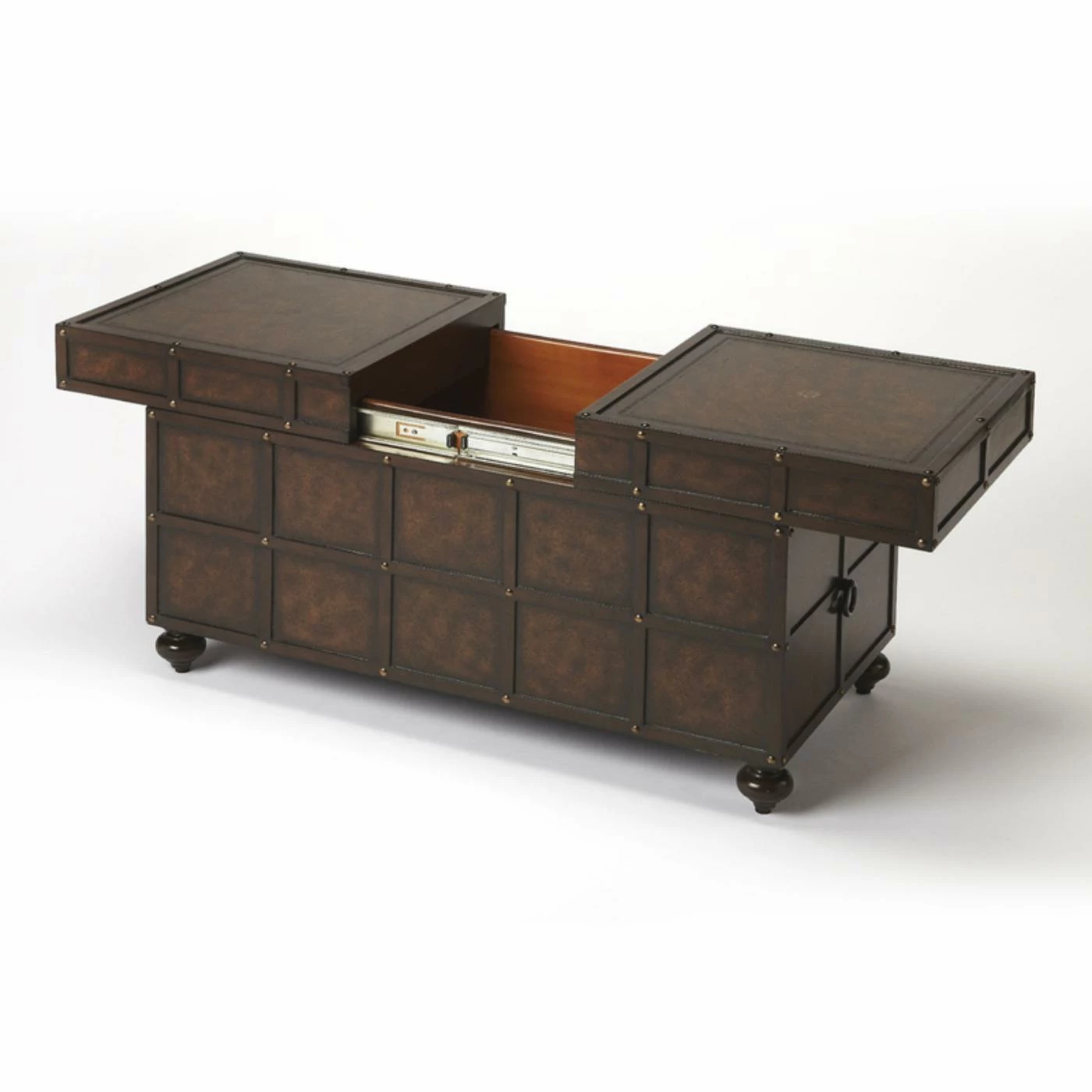 Inspired by classic steamer trunks, the Butler Specialty Dennard Storage Coffee Table functions as the perfect storage unit as well as a coffee table. It has two doors that open from the center up to reveal a spacious interior compartment. It’s vintage design is highlighted by the rich cocoa finish, faux leather accents, and antique brass nail heads and ring pulls. It’s supported by charming bun feet.