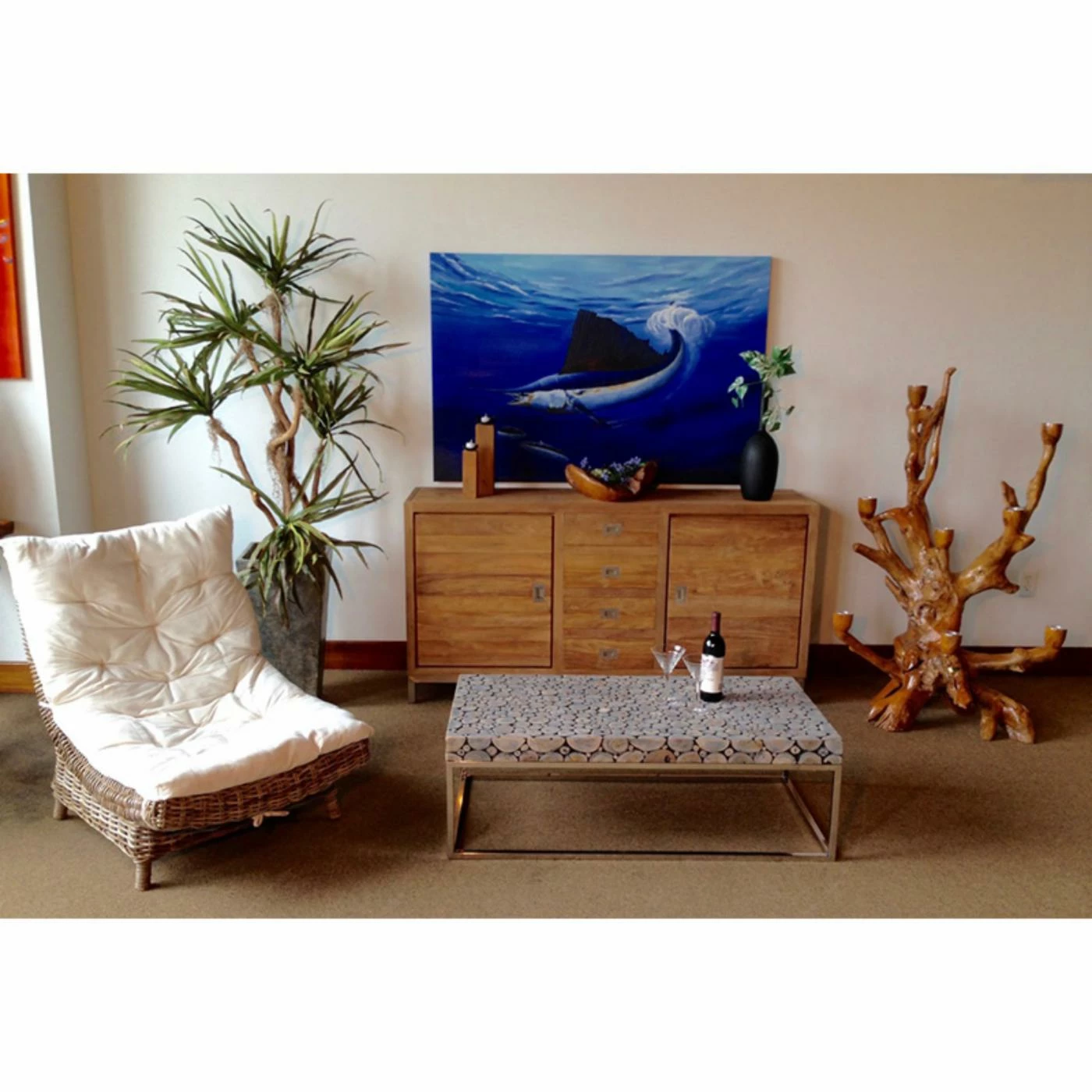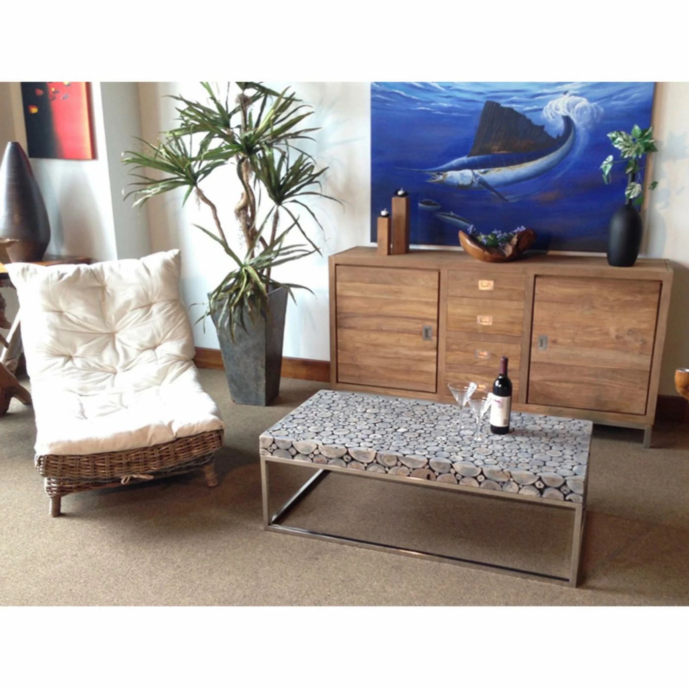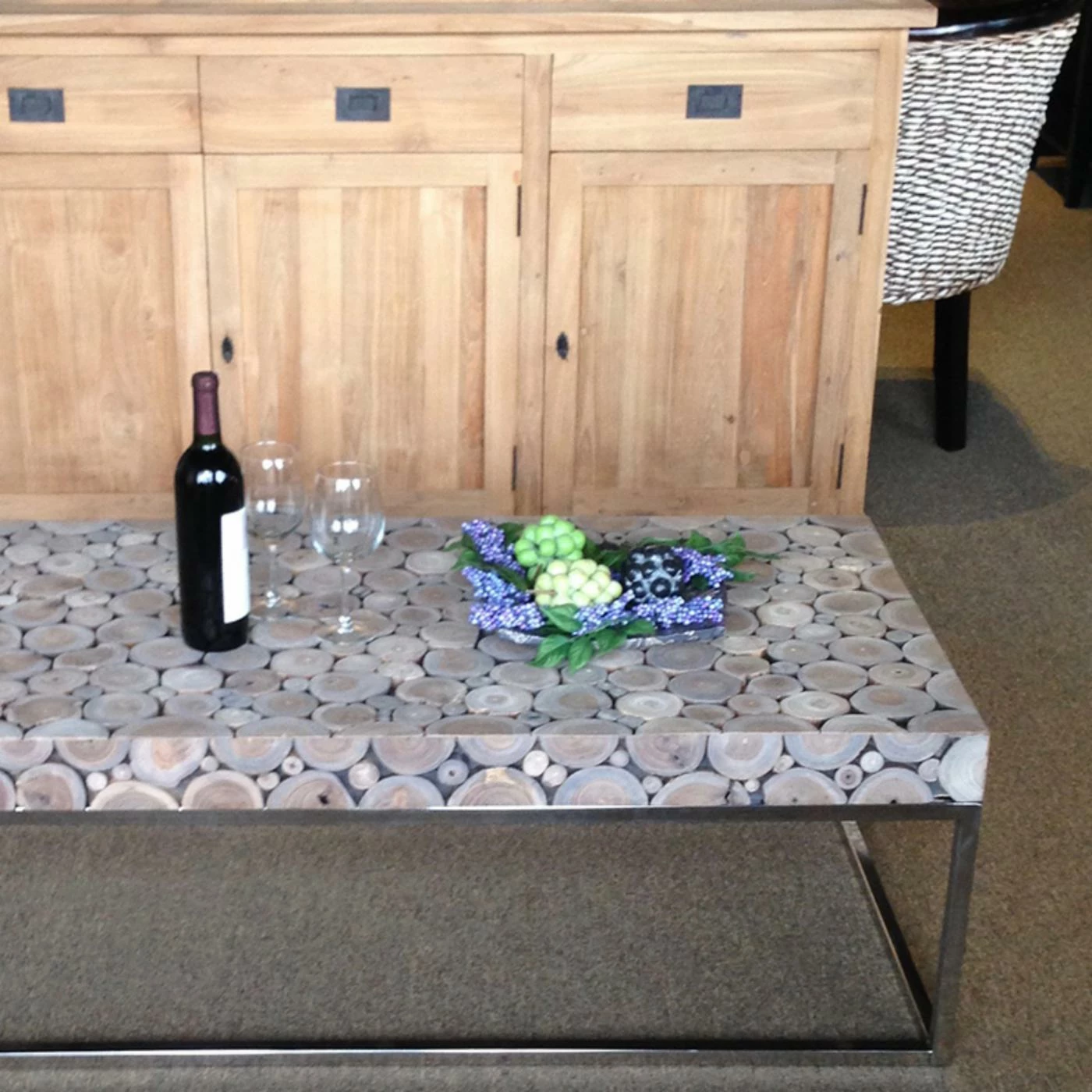 From unwinding to entertaining, the Chic Teak Teak Coffee Table with Stainless Base offers a casual sense of sophistication. Cross sections of branches and limbs showcase the rings and natural variations that mother nature took years to produce. Square tubular stainless steel in a chromed finish creates a strong, modern base. Pair this table with contemporary or transitional dรฉcor!