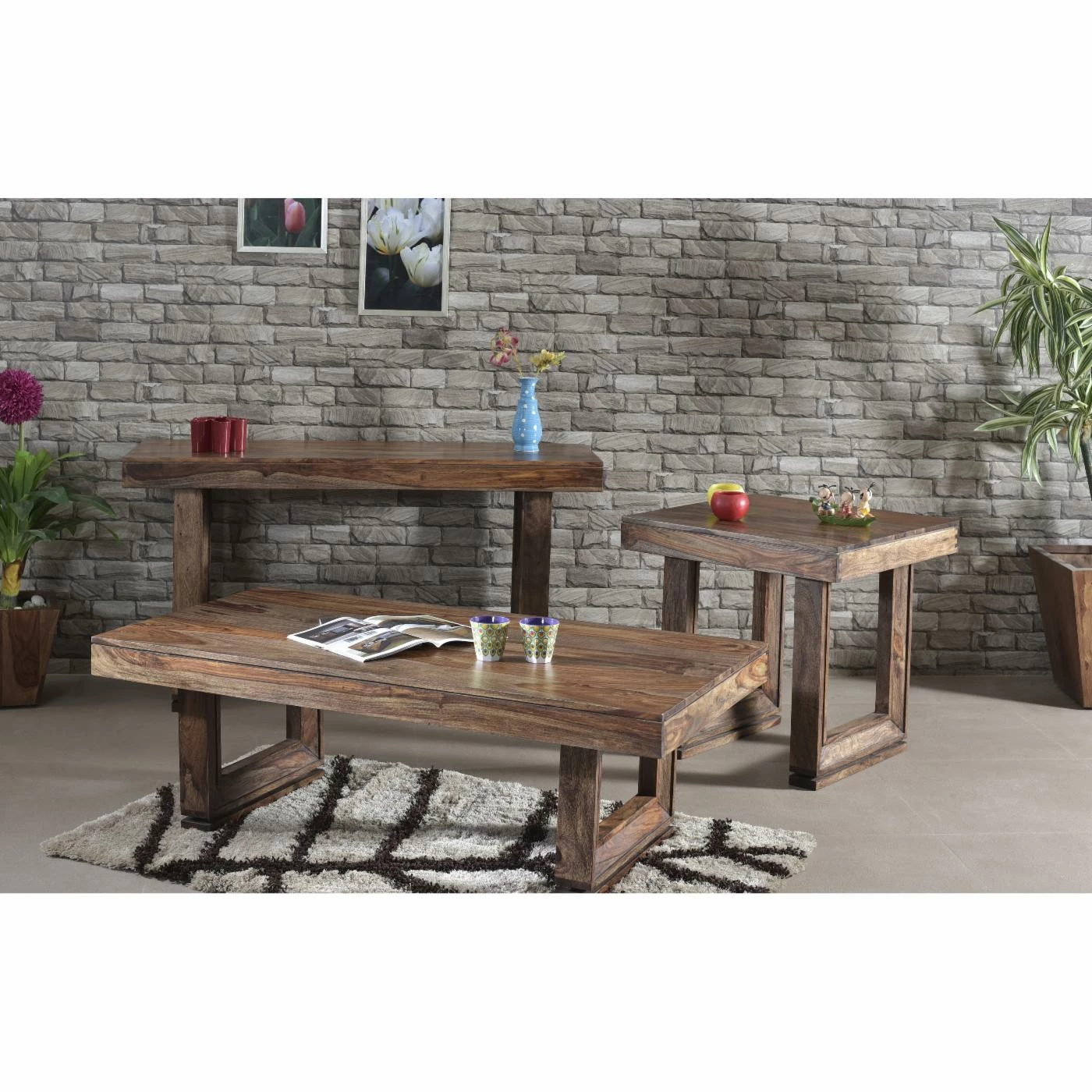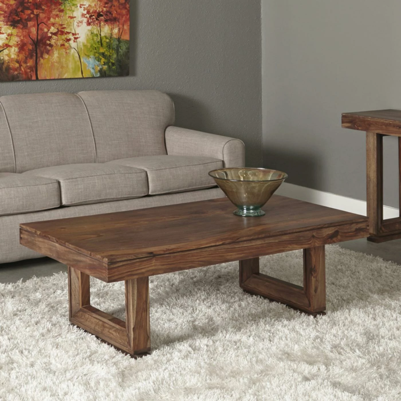 A rich finish makes the Coast to Coast Imports Brownstone Coffee Table versatile in many homes. This sturdy piece is constructed of Sheesham wood for durability. Routing along the apron and leg base makes this table seemingly float off of the floor.