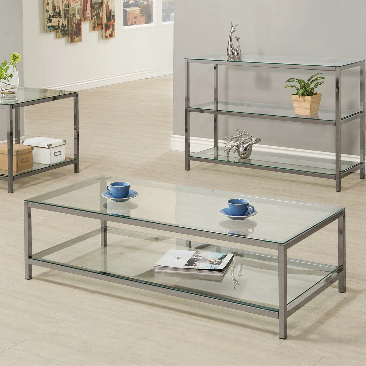 Bring a modern aesthetic to your home with the Coaster Furniture Glass Top Coffee Table – Black Nickel. From its sleek lines to its dark nickel finish, this coffee table brims with eye-catching appeal. Its full bottom shelf offers enhanced storage space, while its glass top offers an elegant nuance to your dΓ©cor.