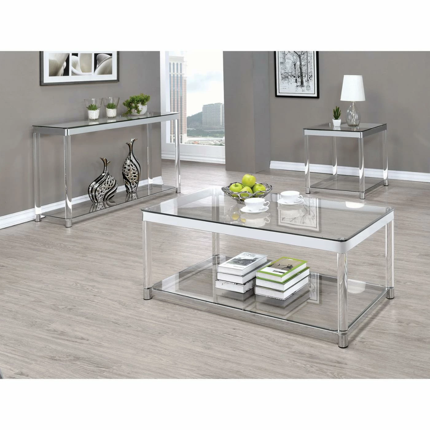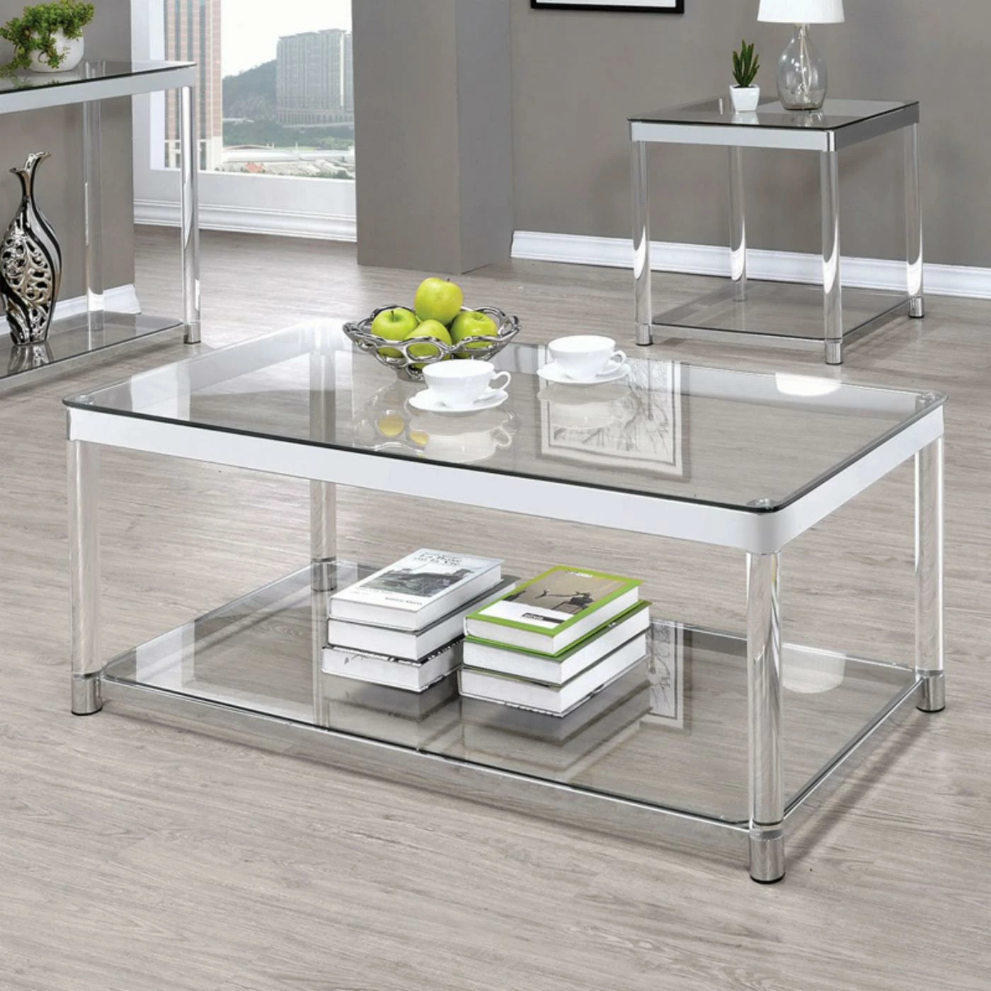 Lend usable display and storage space to your living area with the streamlined glamour of Coaster Furniture Rectangular Glass Top Coffee Table. This rectangular coffee table features softly rounded edges and cylindrical acrylic legs for a sleek and stylish appeal. The top and lower shelf are crafted from five millimeter thick glass, keeping this coffee table’s silhouette light and airy.