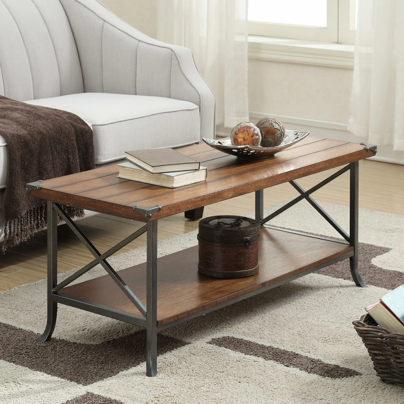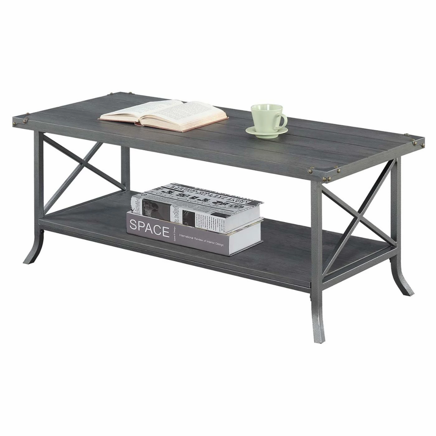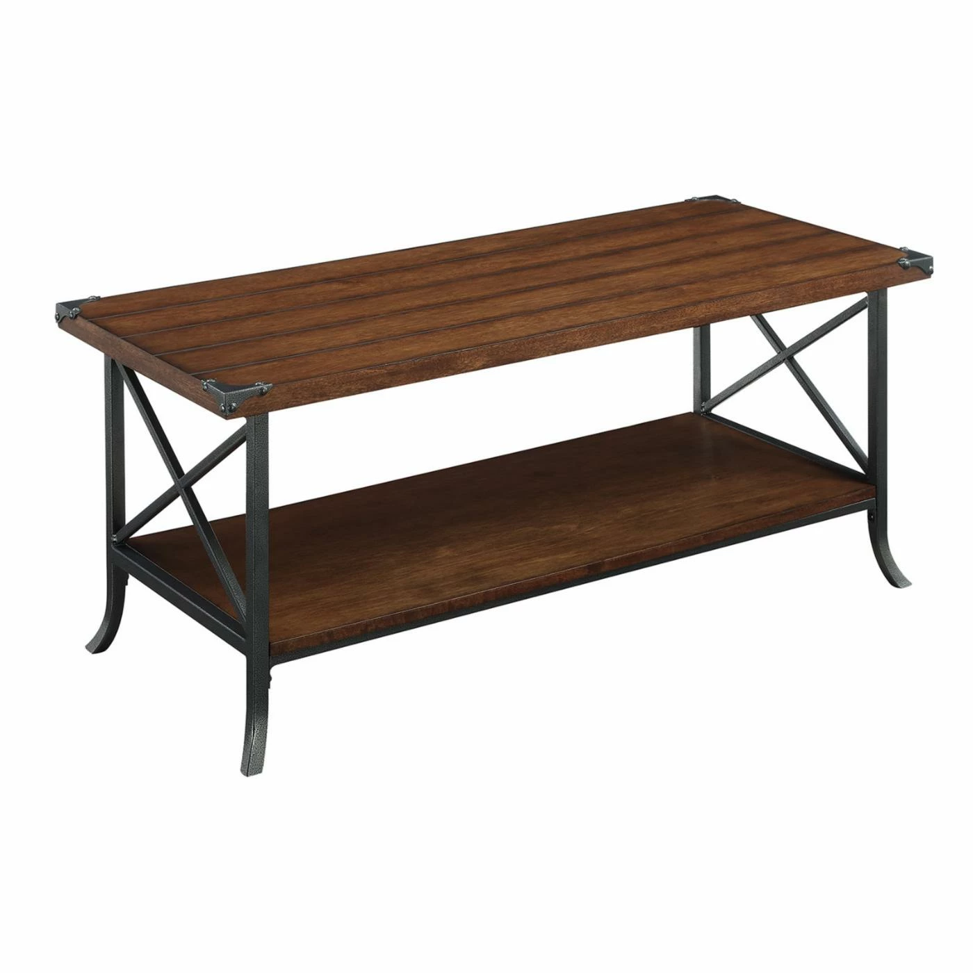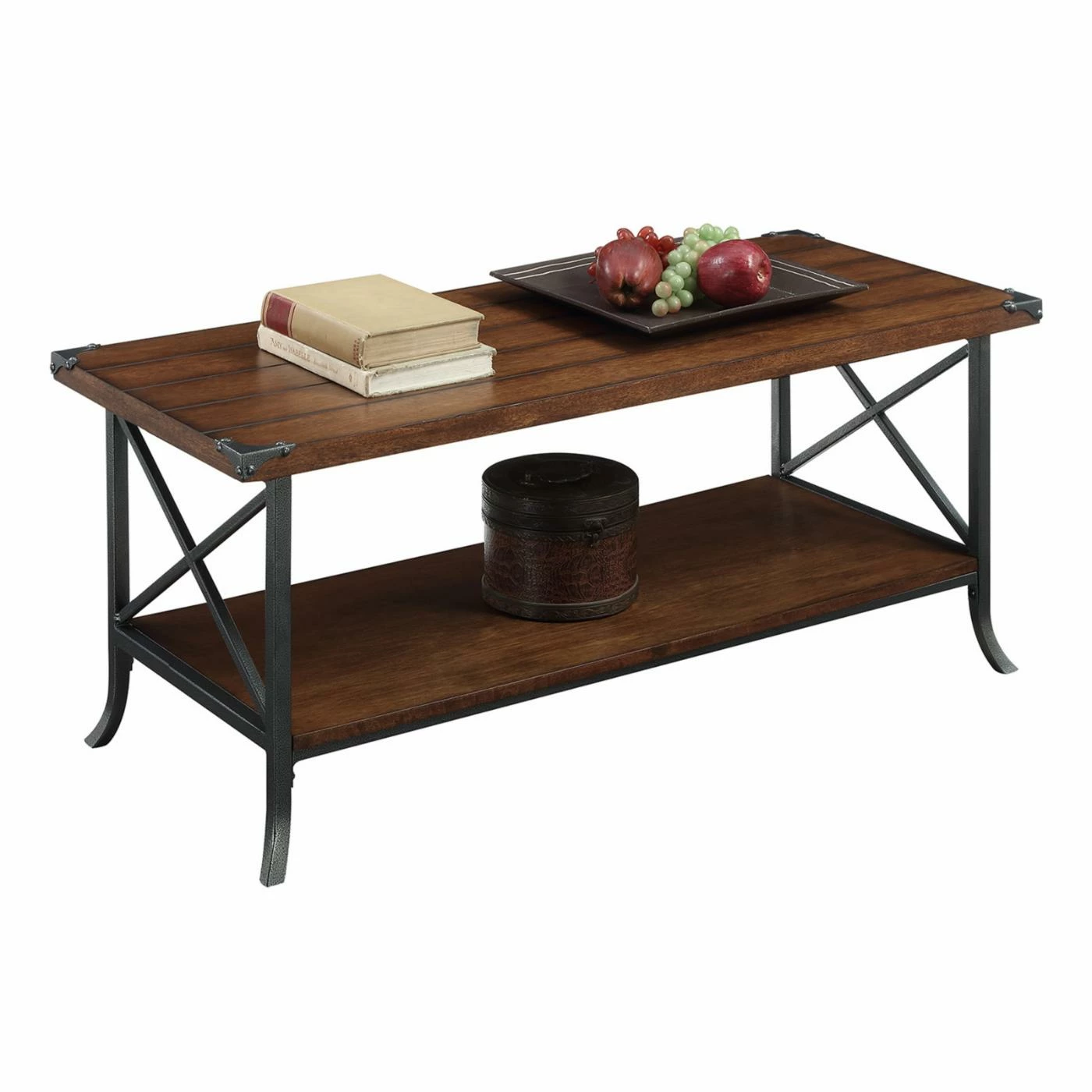 Lend your living room some rustic charm with the Convenience Concepts Brookline Coffee Table. This rectangular coffee table has a rich color scheme with subtle industrial flair. Its frame is supported by thick metal with X-shaped sides and scrolled feet. The tabletop and spacious lower display shelf are rendered from engineered wood planks in your choice of available finishes.