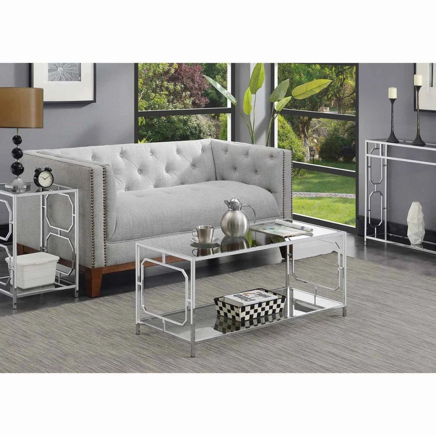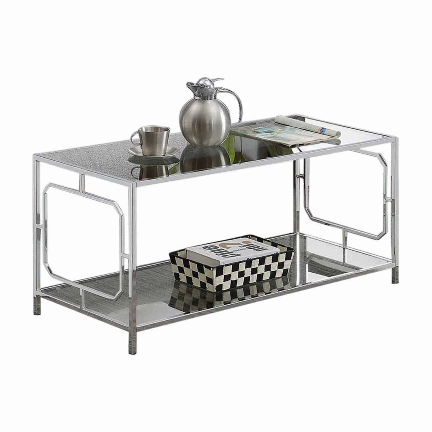 Make a statement with the Convenience Concepts Omega Chrome Coffee Table. This contemporary coffee table features a metal frame in a glam chrome finish. Each side of the coffee table features a floating octagonal detail. The rectangular table top is constructed of clear, tempered glass. A clear glass shelf provides open storage for your favorite books, magazines, or other items that might clutter up your living room. Some simple assembly is required.