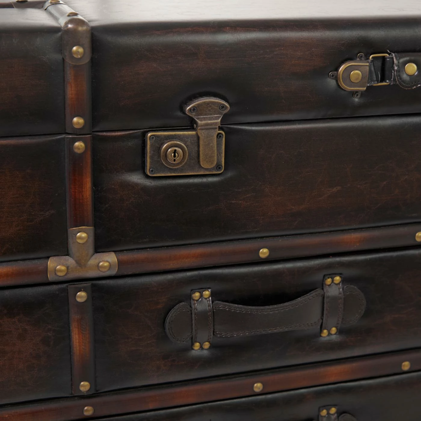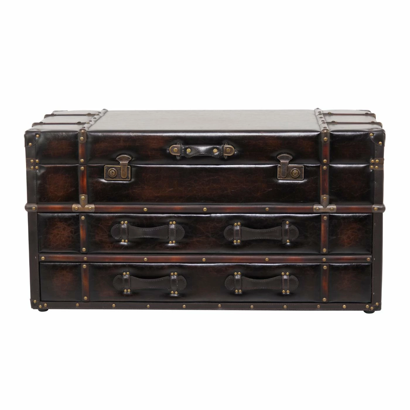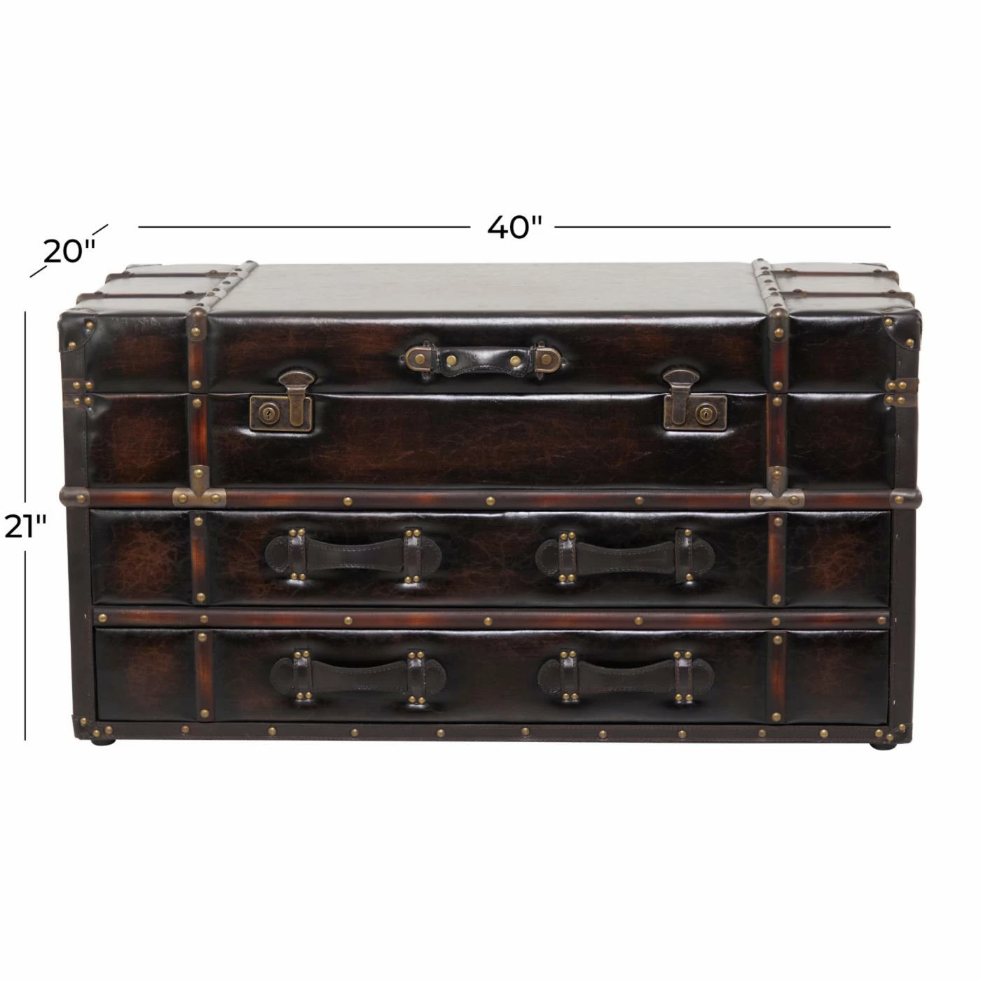 Introduce a travel theme and functional storage into your living room or library with the DecMode Coffee Table with Drawers. The vintage trunk design is wrapped in mahogany faux leather with cherry wood strips and brass nail head detailing. Its drawers boast leatherette strap handles.