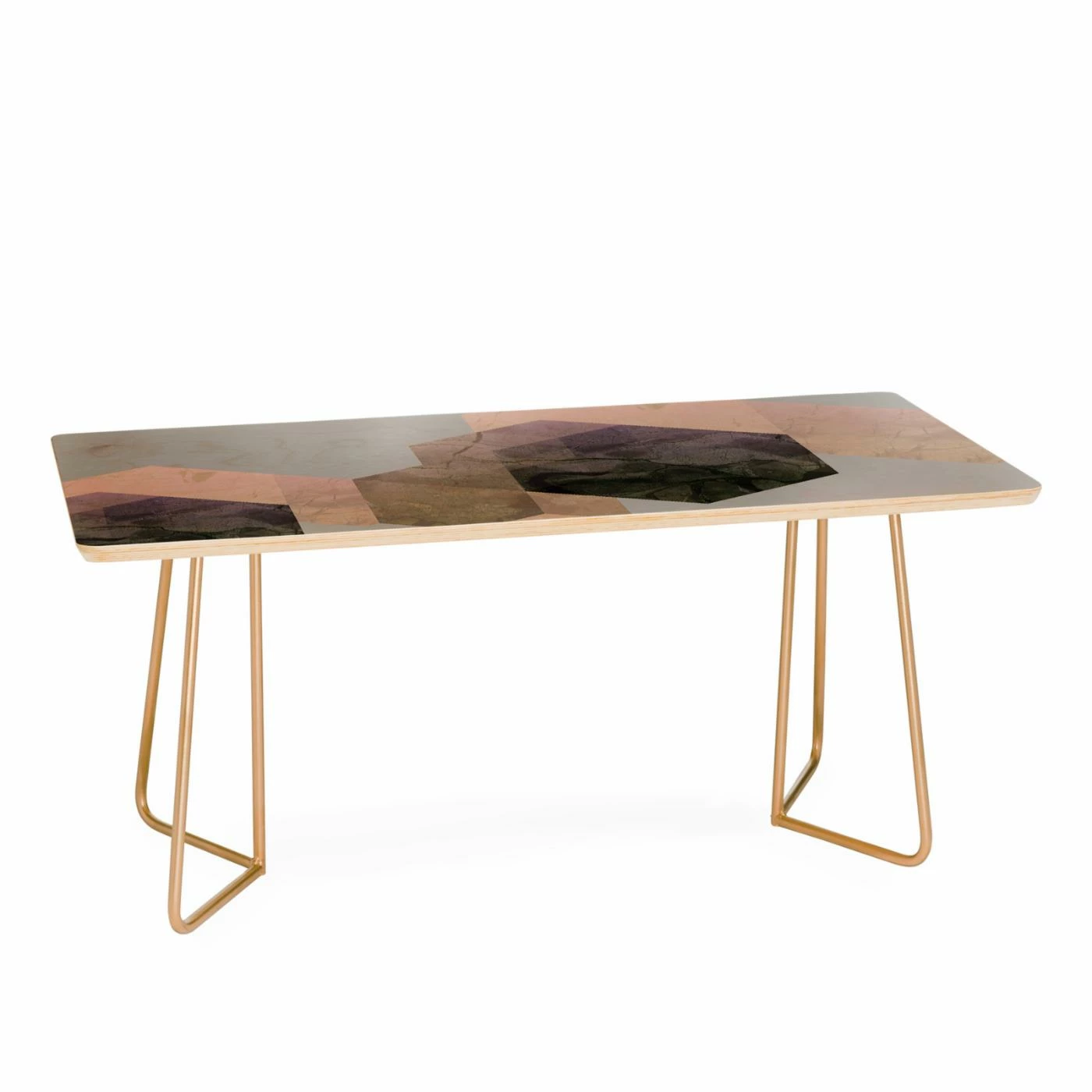 With its layered hexagons and sophisticated palette, the Deny Designs Emanuela Carratoni Marble Geometry Coffee Table is an easy way to add modern art into your living room. This coffee table boasts a rectangular Baltic birch art-print top with protective gloss finish. To get a modern glam appeal, it stands on slim, angled metal legs in a gold finish.
