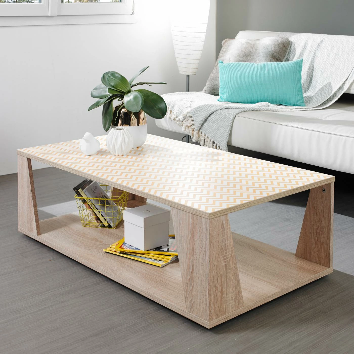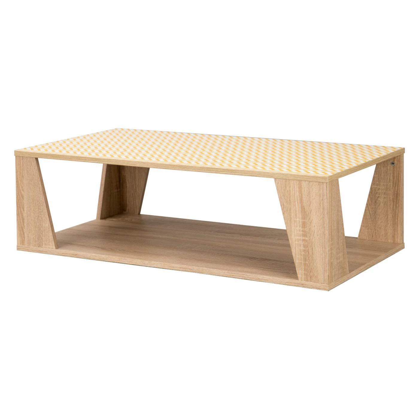 The Diagone Nordic Coffee Table brings the subtle simplicity of Scandinavian style to life with a pop of color. This coffee table’s oak veneer is accented by yellow and white chevron stripes across the tabletop. A wide lower shelf below offers room for holding remotes, magazines, and coffee table books.