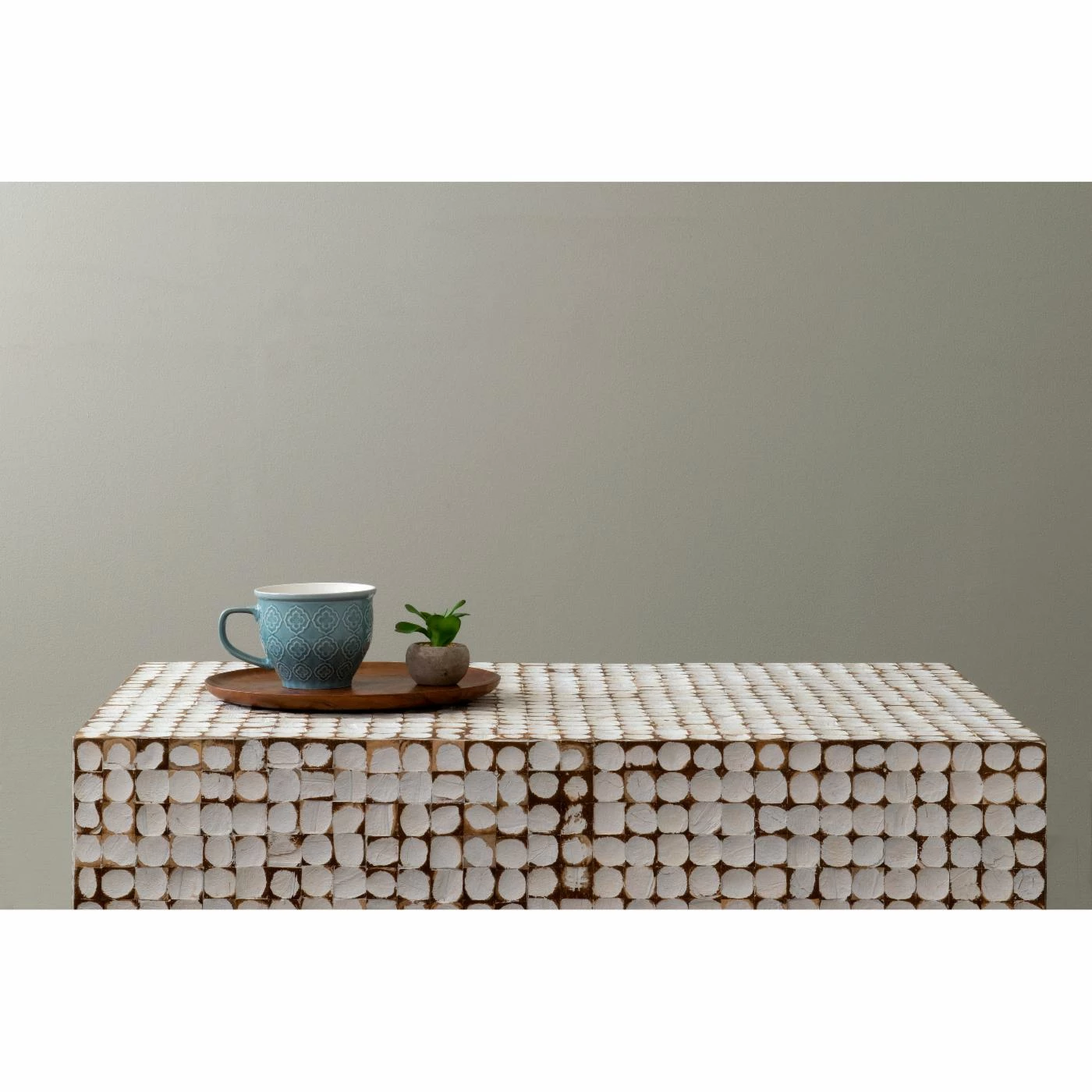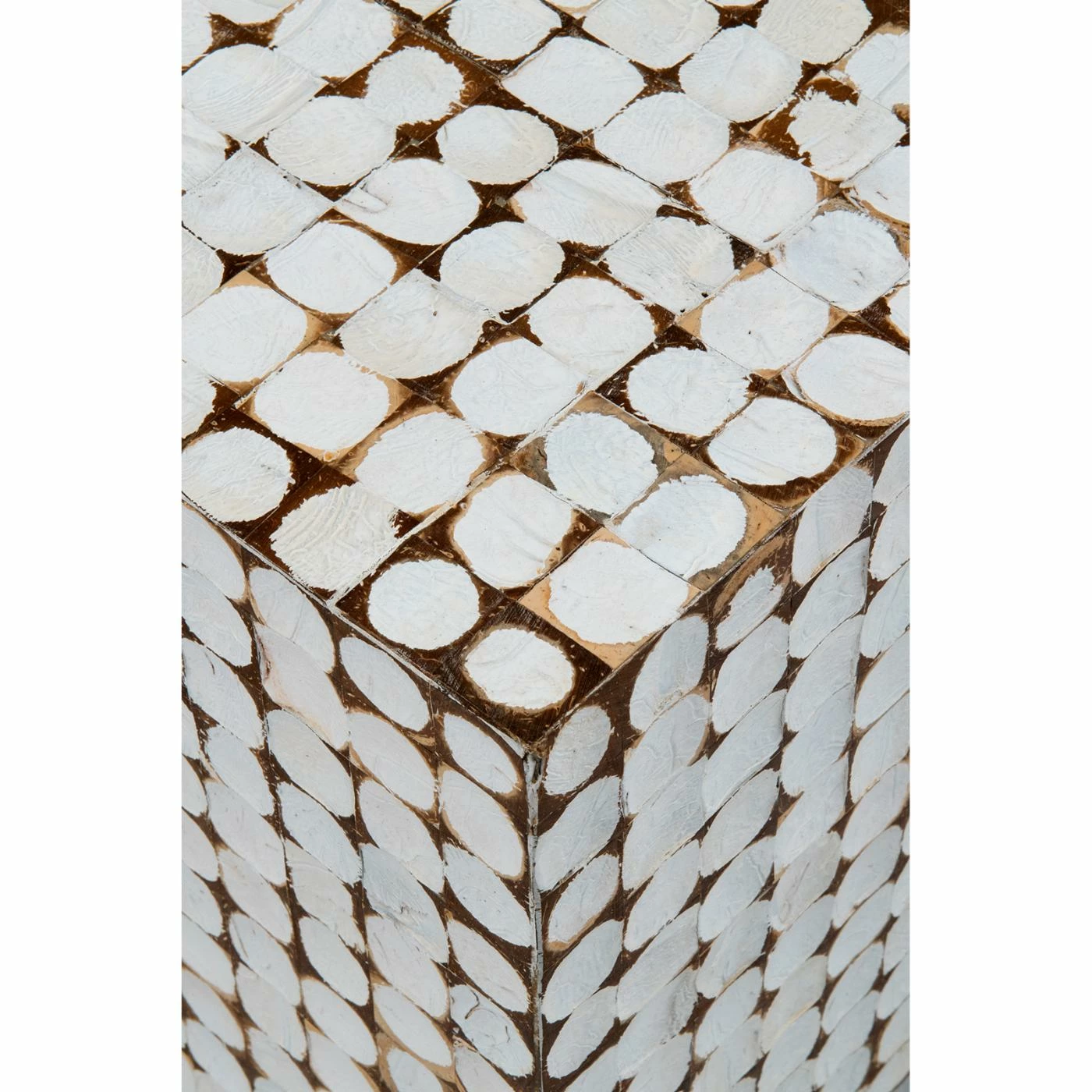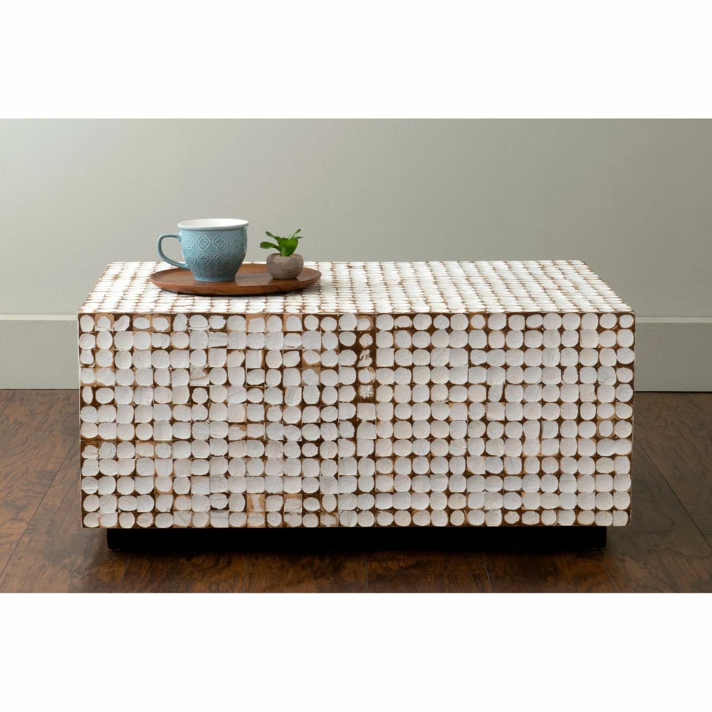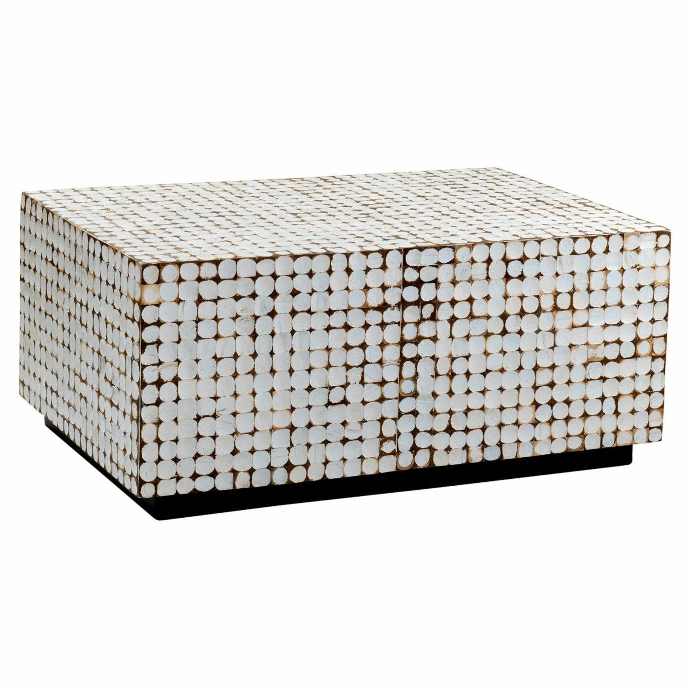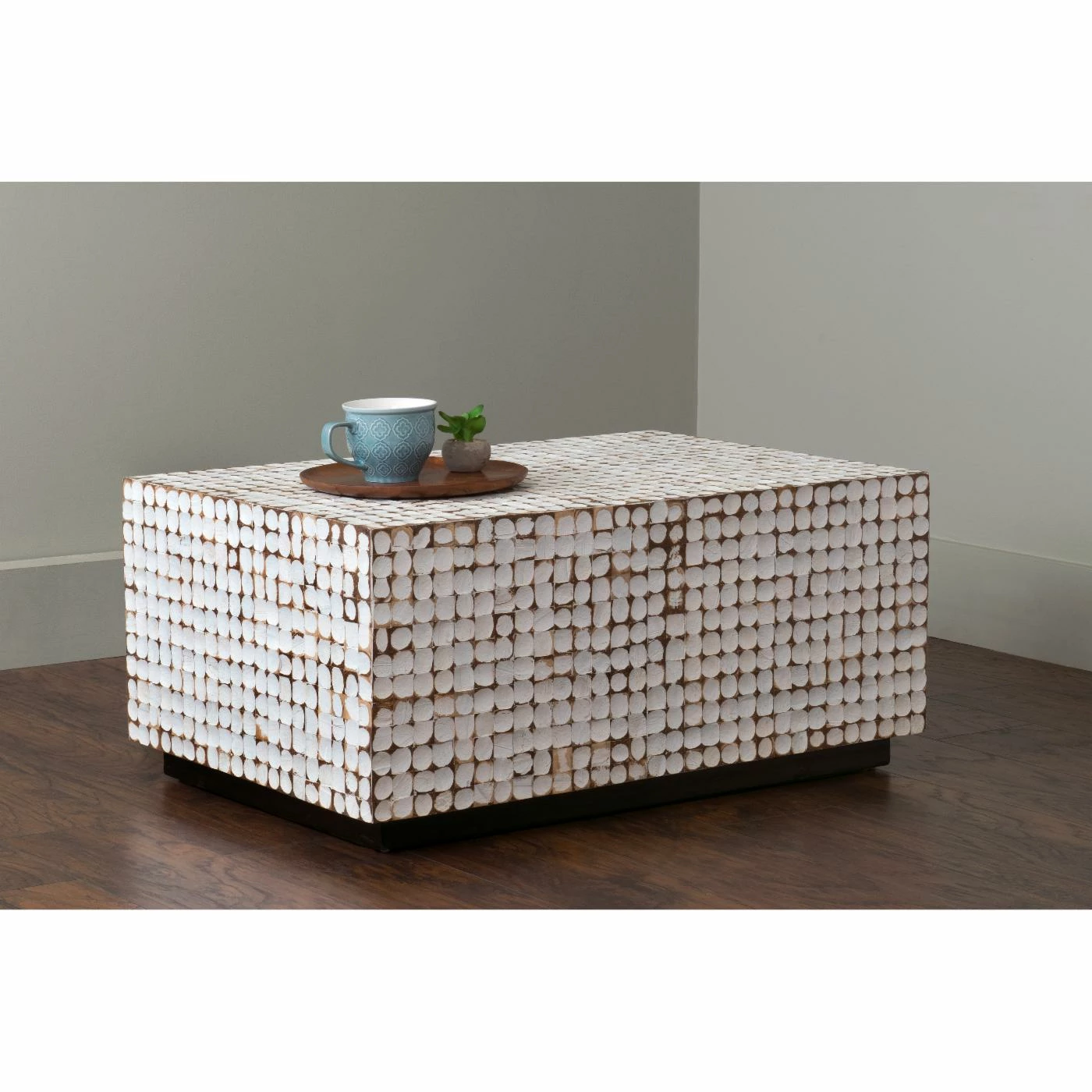 You’ll love the tropical flair the East At Main Dellwood Coconut Shell Inlay Rectangle Coffee Table brings to your living room decor. This coffee table is embellished with hand-applied coconut shell pieces for a mosaic look. This contemporary, sophisticated coffee table features a cottage white and natural finish.
