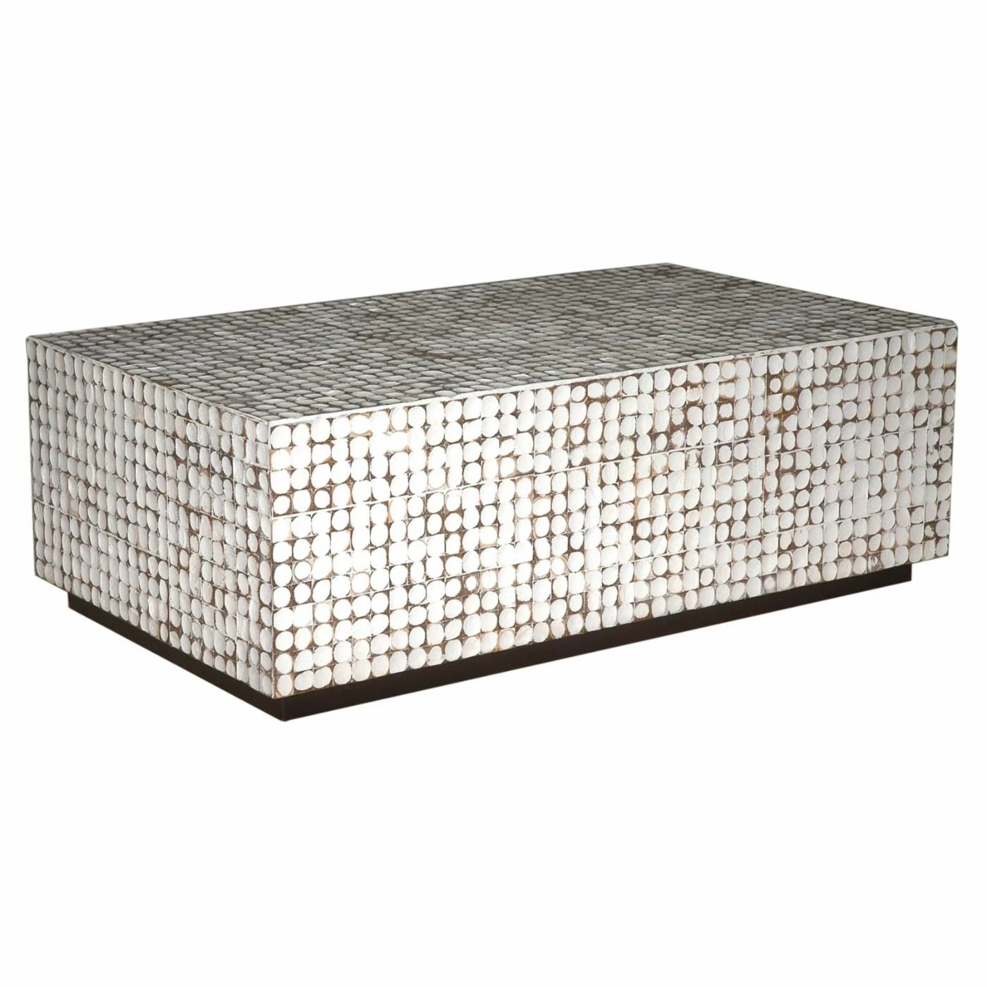 Place this East at Main New Hampton Rectangular Coffee Table in your living room for an eye-catching addition to your dΓ©cor. Featuring quality coconut shell and teak wood construction, this coffee table is finished in black and patina shades for visual allure.