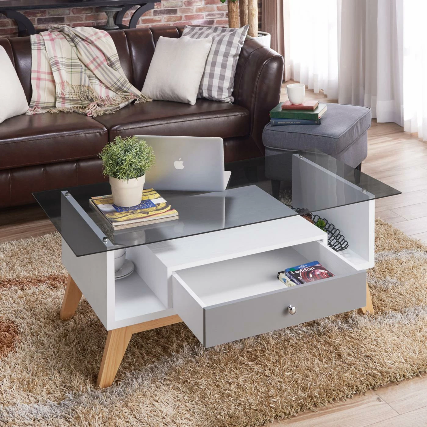The Furniture of America Edwine Modern Coffee Table adds interest and modern design to your home. Its wood veneer and engineered wood frame is finished in white and features a unique, open geometric shelf that’s perfect for holding books and other small items. The single drawer, with a front that comes in your choice of available colors, gives you a place to store your remotes, cords, and devices. Tapered legs are finished in oak to handsomely contrast with the smokey glass top, giving you a striking coffee table that’s sure to be a favorite.