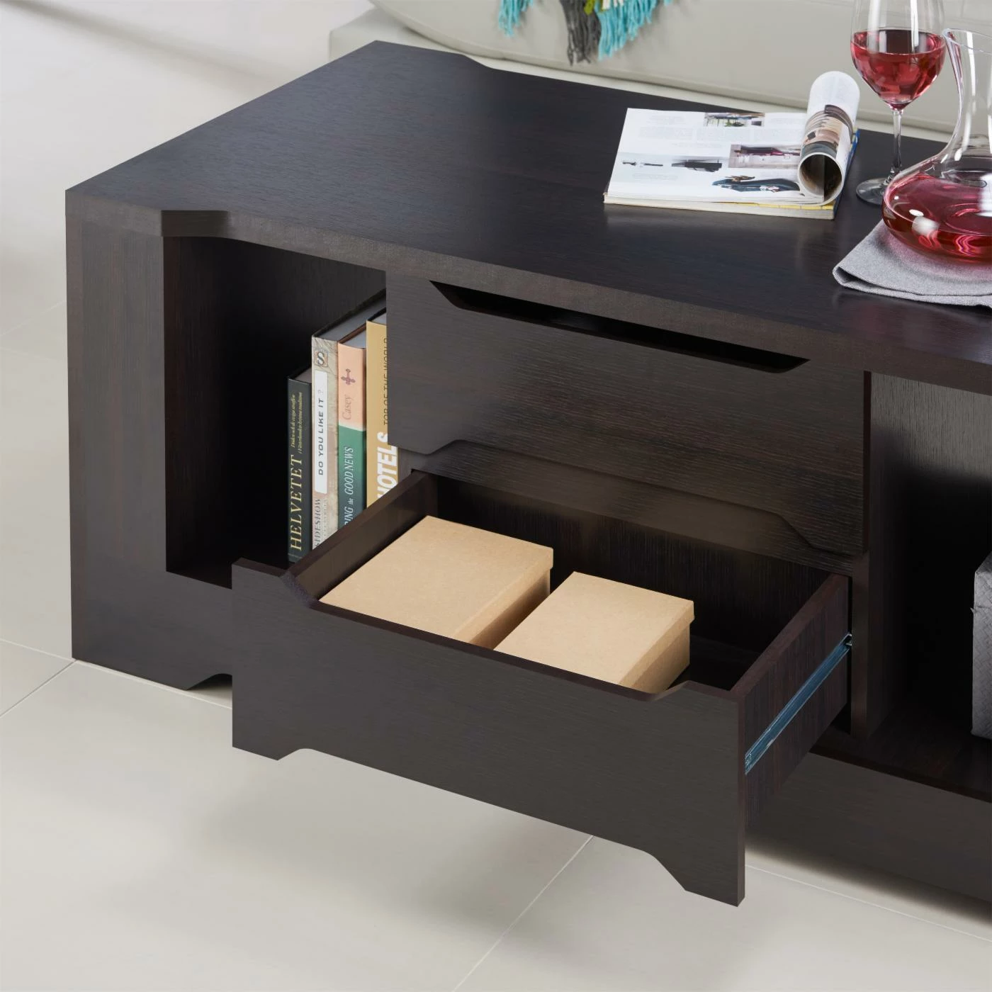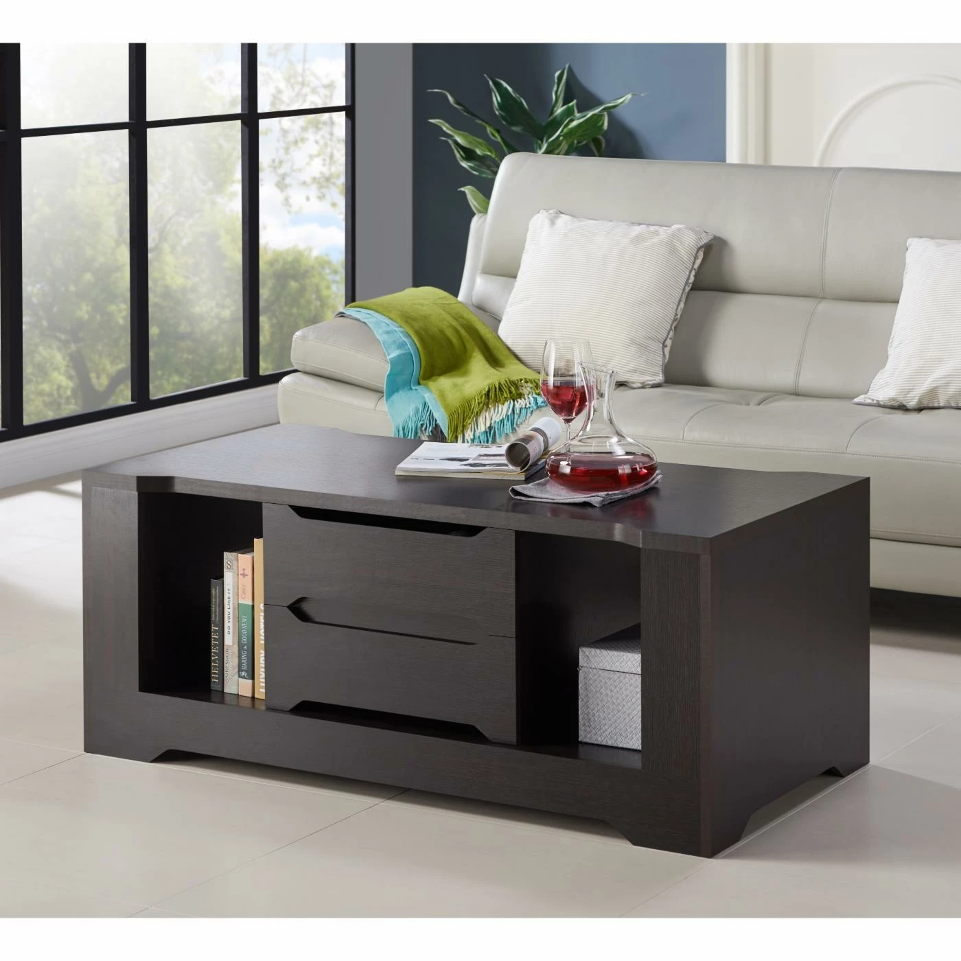 For a contemporary look, the Furniture of America Jonah Modern Storage Coffee Table uses notched angles as drawer pulls. Delight in the modernity of this rectangular coffee table. You’ll also be happy to use the two drawers for tucked away storage and the two open shelves for display pieces. This coffee table comes in a versatile espresso finish.